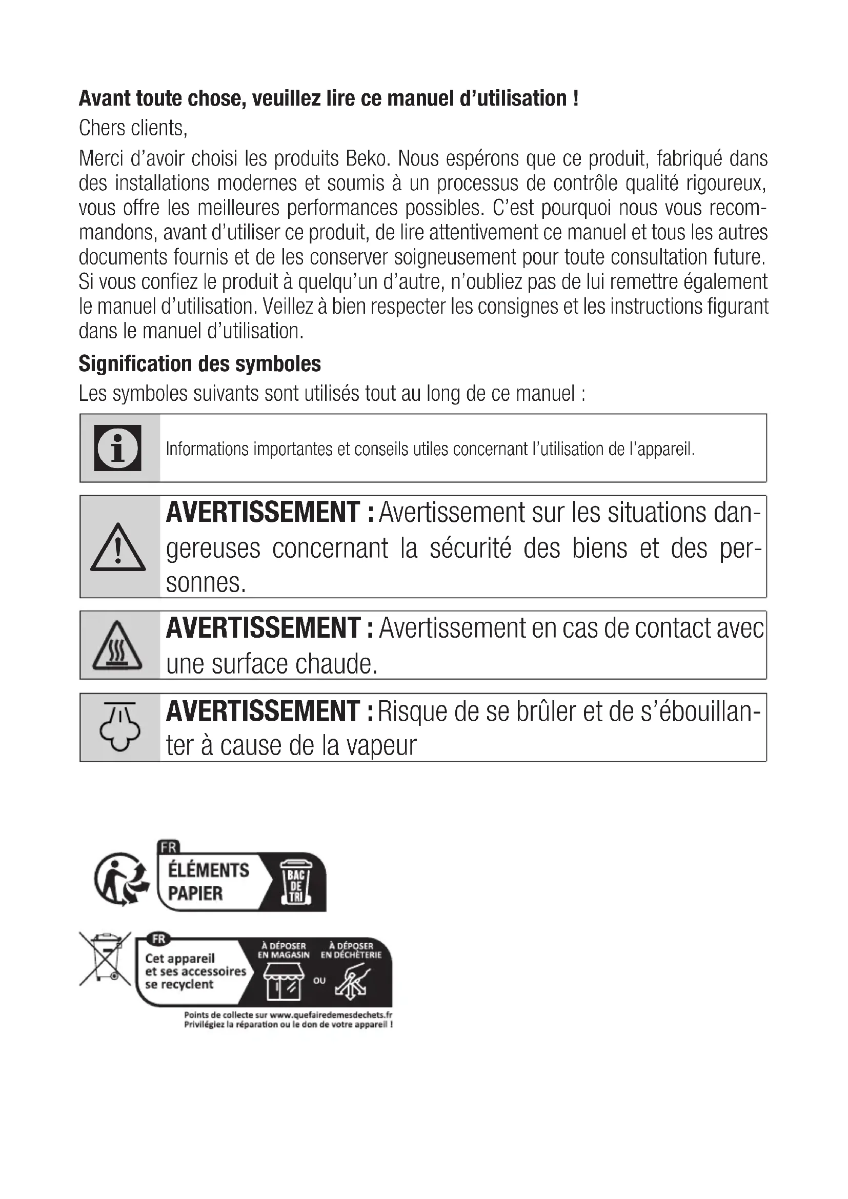 Beko Germany GmbH, Rahmannstrasse 3, 65760 EschbornAvant toute chose, veuillez lire ce manuel d’utilisation ! Chers clients, Merci d’avoir choisi les produits Beko. Nous espérons que ce produit, fabriqué dans des installations modernes et soumis à un processus de contrôle qualité rigoureux, vous offre les meilleures performances possibles. C’est pourquoi nous vous recom- mandons, avant d’utiliser ce produit, de lire attentivement ce manuel et tous les autres documents fournis et de les conserver soigneusement pour toute consultation future. Si vous confiez le produit à quelqu’un d’autre, n’oubliez pas de lui remettre également le manuel d’utilisation. Veillez à bien respecter les consignes et les instructions figurant dans le manuel d’utilisation. Signification des symboles Les symboles suivants sont utilisés tout au long de ce manuel :
