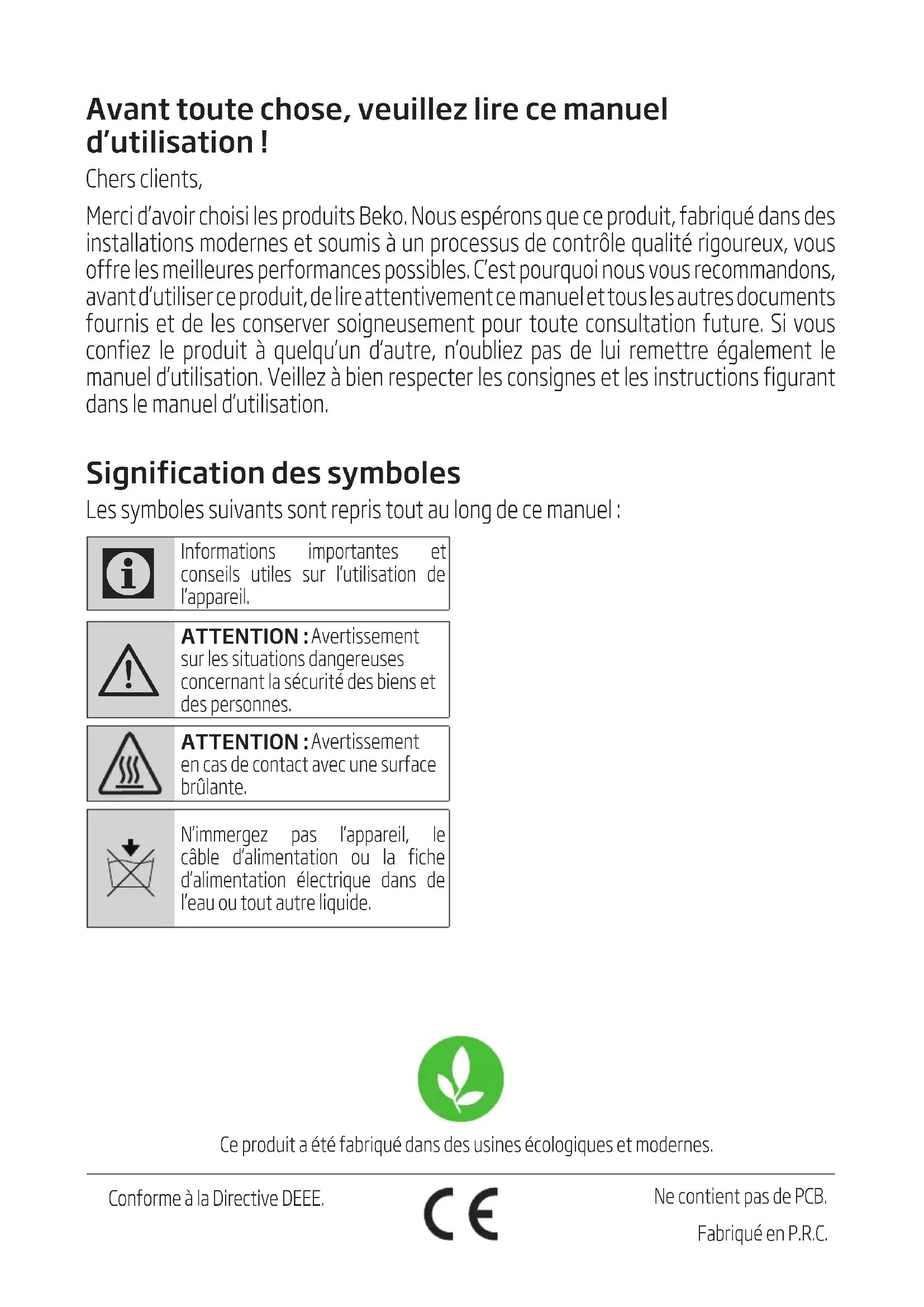 - Nos appareils ménagers de marque BEKO respectent les normes de sécurité applicables. Par conséquent, si l’appareil ou le cordon d’alimentation venait à être endommagé, faites-le réparer ou remplacer par un centre de service agréé afin d’éviter tout danger. Des réparations défectueuses et non professionnelles peuvent être sources de danger et de risque pour l’utilisateur.