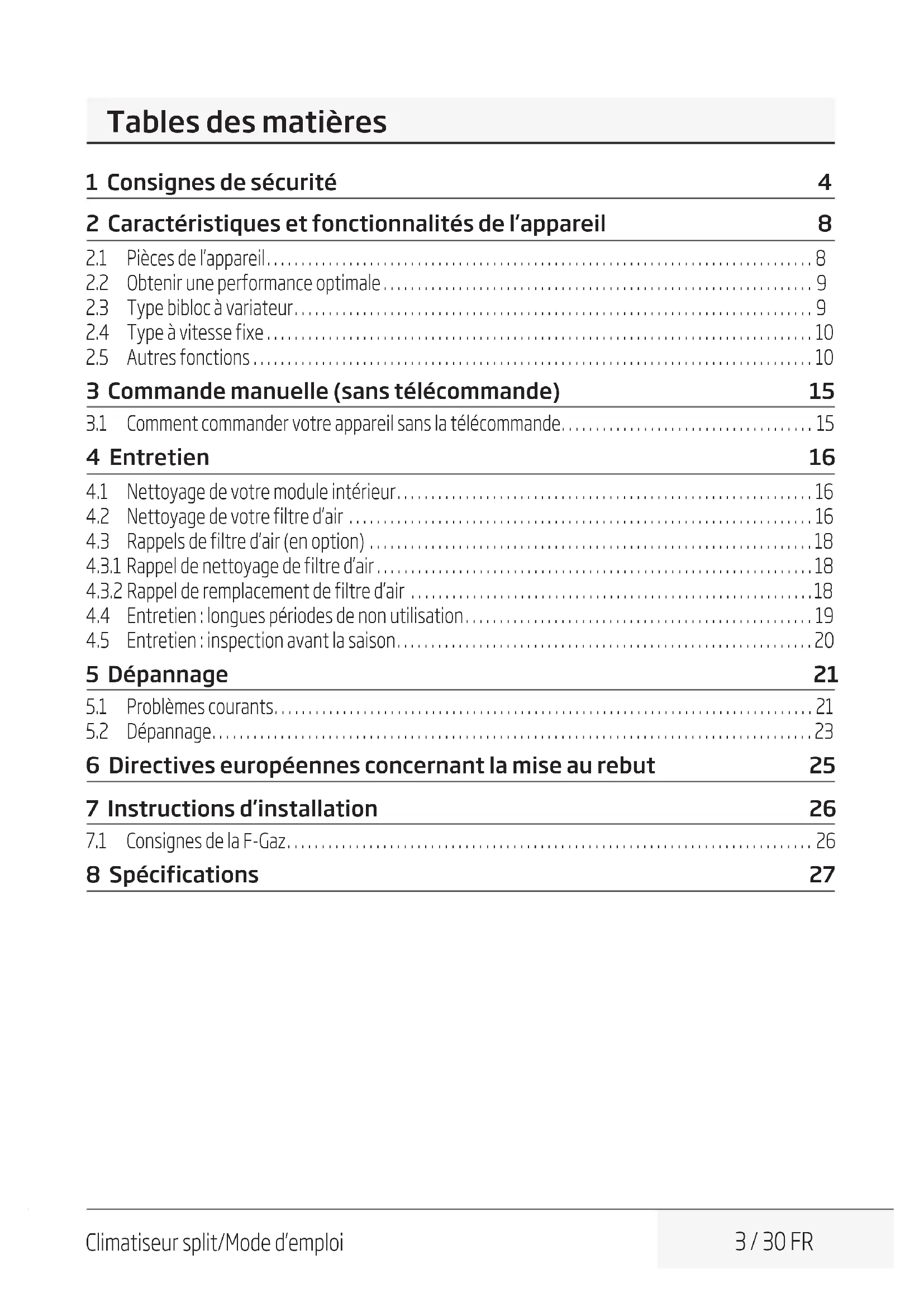 Après de longues périodes sans utilisation ou avant des périodes d’usage fréquent, faites ce qui suit : Vérifiez s’il y a des fils endommagés. Nettoyez tous les filtres. Vérifiez s’il y a des fuites. Remplacez les piles. Vérifiez que rien n’obstrue les entrées et sorties d’air. 4 Entretien 20 / 30 FRClimatiseur split/Mode d’emploi
