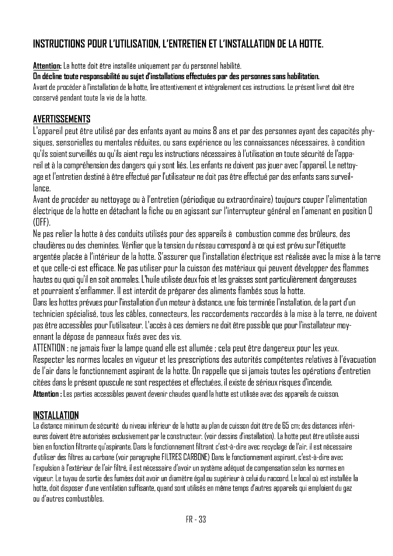 Reinigung der Abzugshaube Eine regelmäßige Reinigung der Oberflächen vermeidet eine spätere schwierige Entfernung von sich angesetzten Verkrustungen. Lackierte oder verkupferte Abzugshauben mit einem weichen Lappen und etwas warmem Wasser und neutralem Reinigungsmittel sauber machen. Es ist verboten, Flüssigkeiten direkt auf die Abzugshaube zu schütten! Keine Scheuermittel verwenden! Abzugs-DE - 32 hauben aus Edelstahl mit Spezialprodukten für matte Edelstahlflächen sauber machen (keine Scheuermittel, ätzende Produkte oder chlorhaltigen Produkte verwenden). Dabei darauf achten, dass mit dem Lappe in Richtung der Oberflächenstruktur gewischt wird. Keine aggressiven Produkte, chemischen Lösungsmittel oder Produkte auf Erdölbasis verwenden, da diese ölige Rückstände hinterlassen, die oxydieren oder polymerisieren können. Hamlet - Romeo: Beim Kochen mit Öl kann das Öl in den unteren Teil der Dunsthaube fließen. Daher sollte man diese Stelle öfters reinigen. Der Hersteller ist nicht für Beeinträchtigungen vom Aussehen der Abzugshaube haftbar, die durch Nichtbeachtung der oben stehenden Hinweise entstanden sind.FR - 33 INSTRUCTIONS POUR L’UTILISATION, L’ENTRETIEN ET L’INSTALLATION DE LA HOTTE. Attention: La hotte doit être installée uniquement par du personnel habilité. On décline toute responsabilité au sujet d’installations effectuées par des personnes sans habilitation. Avant de procéder à l'installation de la hotte, lire attentivement et intégralement ces instructions. Le présent livret doit être conservé pendant toute la vie de la hotte. AVERTISSEMENTS L'appareil peut être utilisé par des enfants ayant au moins 8 ans et par des personnes ayant des capacités phy- siques, sensorielles ou mentales réduites, ou sans expérience ou les connaissances nécessaires, à condition qu'ils soient surveillés ou qu'ils aient reçu les instructions nécessaires à l'utilisation en toute sécurité de l'appa- reil et à la compréhension des dangers qui y sont liés. Les enfants ne doivent pas jouer avec l'appareil. Le nettoy- age et l'entretien destiné à être effectué par l'utilisateur ne doit pas être effectué par des enfants sans surveil- lance. Avant de procéder au nettoyage ou à l’entretien (périodique ou extraordinaire) toujours couper l'alimentation électrique de la hotte en détachant la fiche ou en agissant sur l’interrupteur général en l’amenant en position 0 (OFF). Ne pas relier la hotte à des conduits utilisés pour des appareils à combustion comme des brûleurs, des chaudières ou des cheminées. Vérifier que la tension du réseau correspond à ce qui est prévu sur l’étiquette argentée placée à l’intérieur de la hotte. S’assurer que l’installation électrique est réalisée avec la mise à la terre et que celle-ci est efficace. Ne pas utiliser pour la cuisson des matériaux qui peuvent développer des flammes hautes ou quoi qu’il en soit anomales. L'huile utilisée deux fois et les graisses sont particulièrement dangereuses et pourraient s’enflammer. Il est interdit de préparer des aliments flambés sous la hotte. Dans les hottes prévues pour l'installation d'un moteur à distance, une fois terminée l'installation, de la part d'un technicien spécialisé, tous les câbles, connecteurs, les raccordements raccordés à la mise à la terre, ne doivent pas être accessibles pour l'utilisateur. L'accès à ces derniers ne doit être possible que pour l'installateur moy- ennant la dépose de panneaux fixés avec des vis. ATTENTION : ne jamais fixer la lampe quand elle est allumée ; cela peut être dangereux pour les yeux. Respecter les normes locales en vigueur et les prescriptions des autorités compétentes relatives à l’évacuation de l’air dans le fonctionnement aspirant de la hotte. On rappelle que si jamais toutes les opérations d’entretien citées dans le présent opuscule ne sont respectées et effectuées, il existe de sérieux risques d’incendie. Attention : Les parties accessibles peuvent devenir chaudes quand la hotte est utilisée avec des appareils de cuisson. INSTALLATION La distance minimum de sécurité du niveau inférieur de la hotte au plan de cuisson doit être de 65 cm; des distances inféri- eures doivent être autorisées exclusivement par le constructeur. (voir dessins d’installation). La hotte peut être utilisée aussi bien en fonction filtrante qu’aspirante. Dans le fonctionnement filtrant c’est-à-dire avec recyclage de l’air, il est nécessaire d’utiliser des filtres au carbone (voir paragraphe FILTRES CARBONE) Dans le fonctionnement aspirant, c’est-à-dire avec l’expulsion à l’extérieur de l’air filtré, il est nécessaire d’avoir un système adéquat de compensation selon les normes en vigueur. Le tuyau de sortie des fumées doit avoir un diamètre égal ou supérieur à celui du raccord. Le local où est installée la hotte, doit disposer d’une ventilation suffisante, quand sont utilisés en même temps d’autres appareils qui emploient du gaz ou d’autres combustibles.FR - 34 Hottes prévues pour moteur à distance Les hottes prévues pour moteur à distance, sont équipées d'un connecteur pour le raccordement avec le câble du moteur à distance. Ce connecteur se trouve à l'intérieur de la hotte. Insérer à l'intérieur de la hotte le câble du moteur à distance en se servant de l'ouverture prévue à cet effet sur la hotte (elle se trouve d'habitude près du trou de sortie des fumées) et con- necter les deux connecteurs entre eux. Pour cette opération se reporter aux dessins qui se trouvent sur le livret d'instruc- tions des moteurs à distance. Les hottes sans moteur (Art.*0***) doivent être installées et raccordées uniquement avec l'unité aspirante fournie et indi- quée par le Constructeur avec puissance maximale 690W. Dans les hottes prévues pour l'installation d'un moteur à distance, une fois terminée l'installation, d