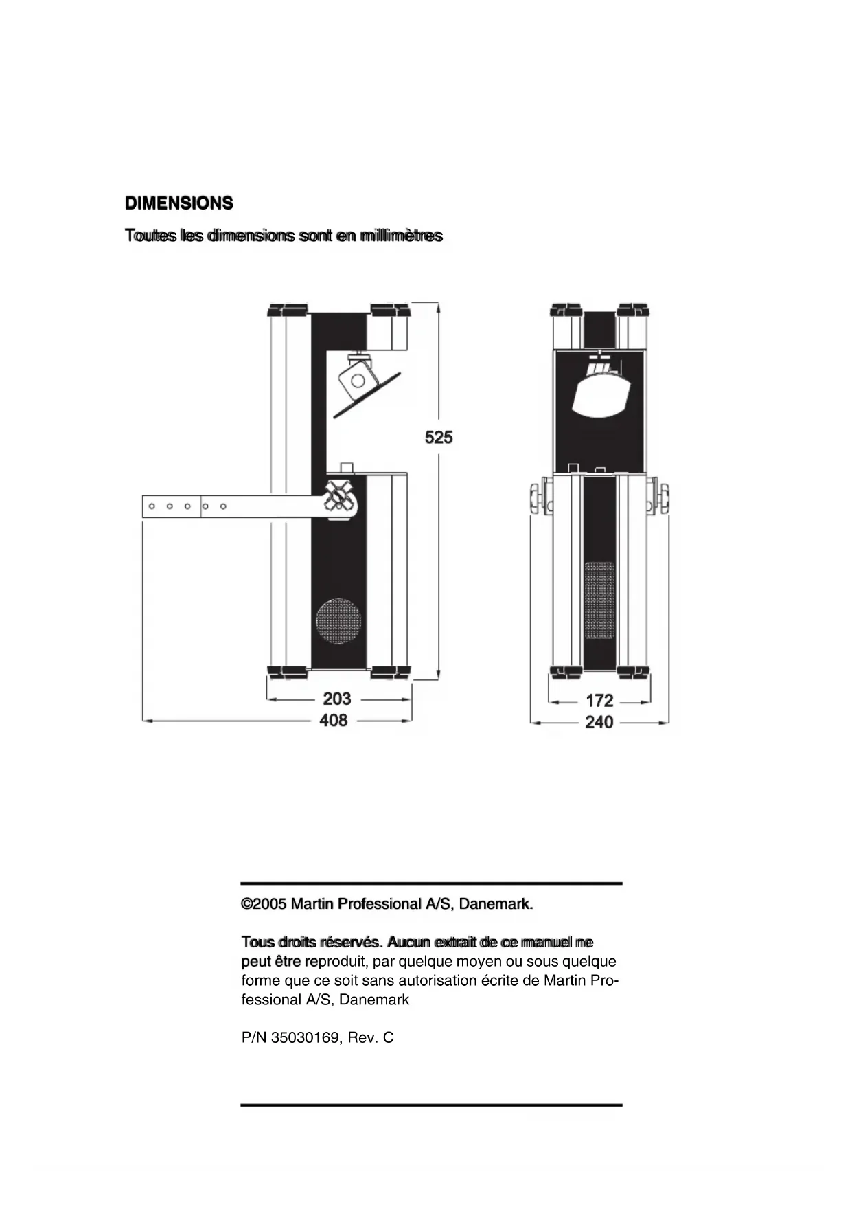 - DIMENSIONS Toutes les dimensions sont en millimètres ©2005 Martin Professional A/S, Danemark. Tous droits réservés. Aucun extrait de ce manuel ne peut être reproduit, par quelque moyen ou sous quelque forme que ce soit sans autorisation écrite de Martin Pro- fessional A/S, Danemark P/N 35030169, Rev. CTable des matières Introduction p. 5