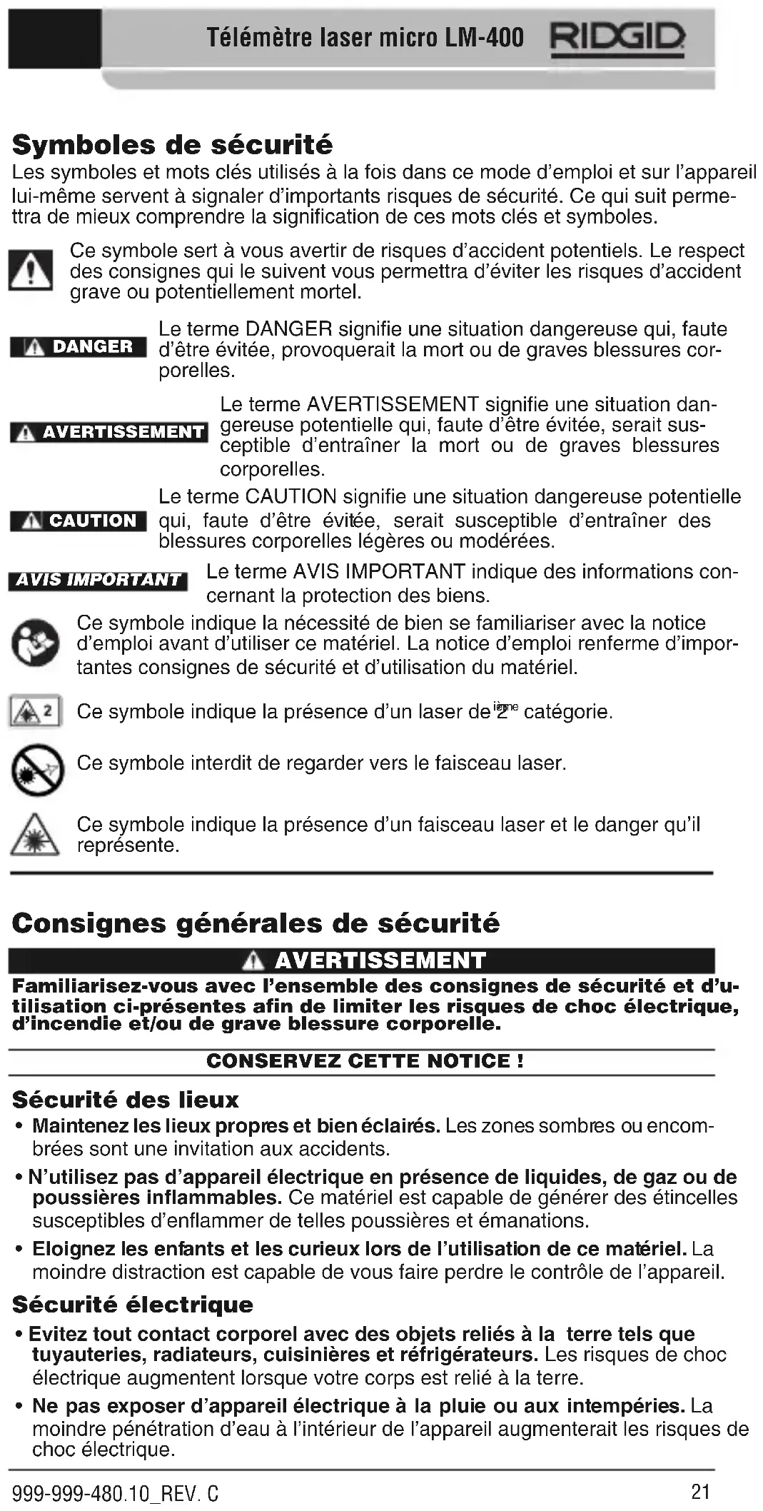 numérique RIDGID micro LM-400 afin de limiter les risques de chocélectrique et autres graves lésions corporelles.CONCERVEZ CETTE NOTICE ! Gardez la notice avec l’appareil afin qu’elle soit à la portée de tout utilisateur éventuel. Sécurité du télémètre laser