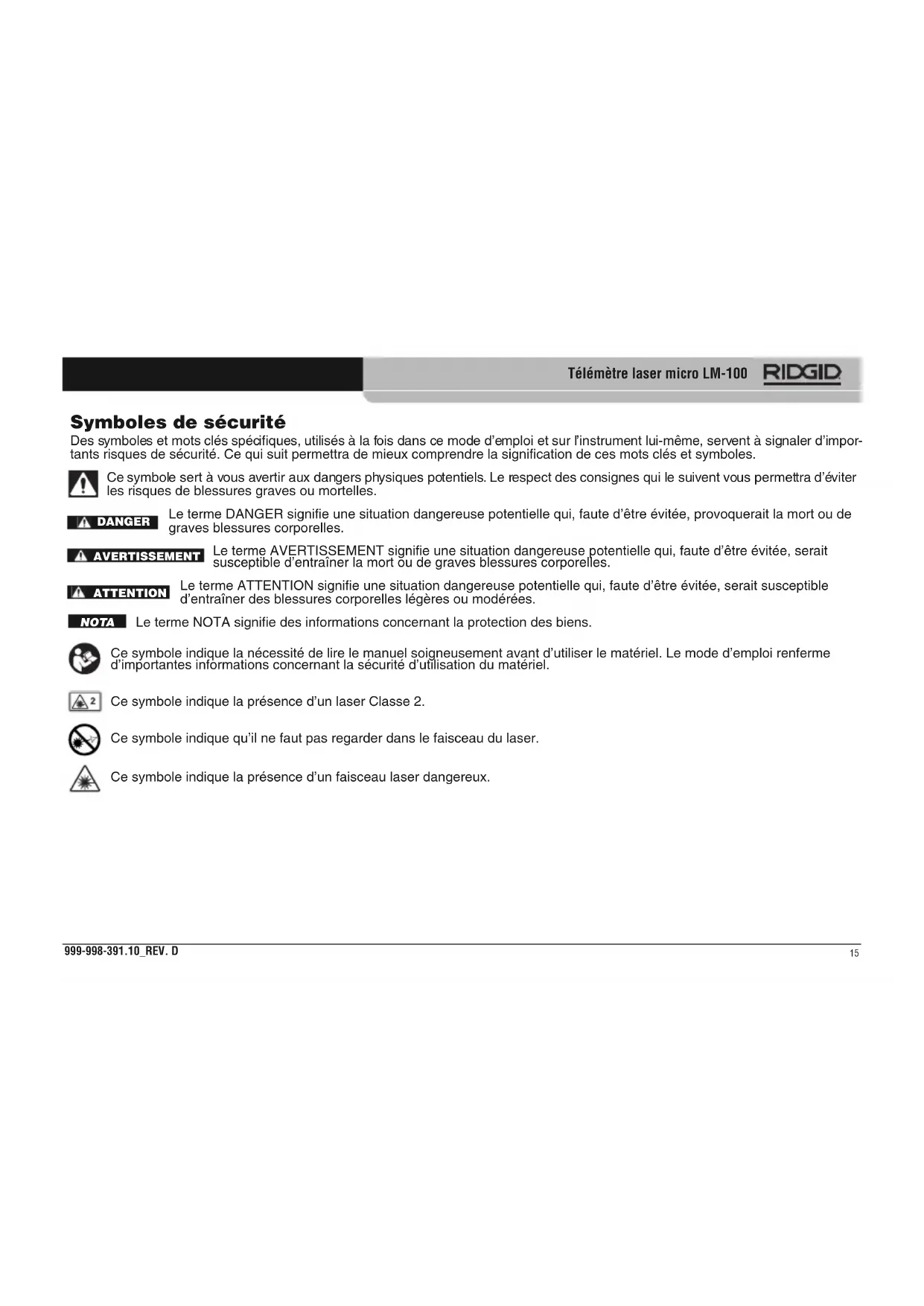 Effacement des détails et dernières mesures.......................22 Révision des 20 dernières mesures prises...........................22 Effacement de la mémoire ....................................................22 Eclairage de fond..................................................................22 Prise de mesures Prise de mesures de distance simple ...................................23 Prise de mesures maxi et mini en continu ............................23 Addition et soustraction des mesures prises ........................23 Mesures de superficie...........................................................23 Mesures de volume ..............................................................23 Mesures indirectes A l’aide de deux points .........................................................24 A l’aide de trois points ..........................................................24 Nettoyage ................................................................................25 Stockage .................................................................................25 Révisions et réparations........................................................25 Recyclage de l’instrument .....................................................25 Dépannage..............................................................................26 Déclaration de conformité CE .............Recto de page de garde Garantie à vie ......................................................Page de garde *Traduction de la notice originale Table des matière Fiche d’enregistrement du numéro de série de l’instrument ............................................................13 Symboles de sécurité.............................................................15 Consignes générales de sécurité Sécurité des lieux .................................................................16 Sécurité électrique ................................................................16 Sécurité individuelle..............................................................16 Utilisation et entretien de l’instrument...................................16 Révisions ..............................................................................17 Consignes de sécurité spécifiques Sécurité du télémètre laser ...................................................17 Description, caractéristiques techniques et équipements de base Description............................................................................17 Caractéristiques techniques..................................................18 Commandes .........................................................................19 Icônes d’affichage LCD.........................................................19 Equipements de base ...........................................................19 Classification du laser ...........................................................20 Avertissement FCC ................................................................20 Compatibilité électromagnétique..........................................20 Montage du bracelet ..............................................................20 Remplacement des piles .......................................................20 Examen préalable...................................................................21 Préparation et utilisation de l’instrument.............................21 Commandes et paramètres du LM-100 Activation/désactivation ........................................................22 Etablissement d’un point de départ ......................................22 Changement d’unités de mesure..........................................22Télémètre laser micro LM-100 Symboles de sécurité Des symboles et mots clés spécifiques, utilisés à la fois dans ce mode d’emploi et sur l’instrument lui-même, servent à signaler d’impor- tants risques de sécurité. Ce qui suit permettra de mieux comprendre la signification de ces mots clés et symboles. Ce symbole sert à vous avertir aux dangers physiques potentiels. Le respect des consignes qui le suivent vous permettra d’éviter les risques de blessures graves ou mortelles. Le terme DANGER signifie une situation dangereuse potentielle qui, faute d’être évitée, provoquerait la mort ou de graves blessures corporelles. Le terme AVERTISSEMENT signifie une situation dangereuse potentielle qui, faute d’être évitée, serait susceptible d’entraîner la mort ou de graves blessures corporelles. Le terme ATTENTION signifie une situation dangereuse potentielle qui, faute d’être évitée, serait susceptible d’entraîner des blessures corporelles légères ou modérées. Le terme NOTA signifie des informations concernant la protection des biens. Ce symbole indique la nécessité de lire le manuel soigneusement avant d’utiliser le matériel. Le mode d’emploi renferme d’importantes informations concernant la sécurité d’utilisation du matériel. NOTA DANGER AVERTISSEMENT ATTENTION Ce symbole indique la présence d’un laser Classe 2. Ce symbole indique qu’il ne faut pas regarder dans le faisceau du laser. Ce symbole indique la présence d’un faisceau laser dangereux.