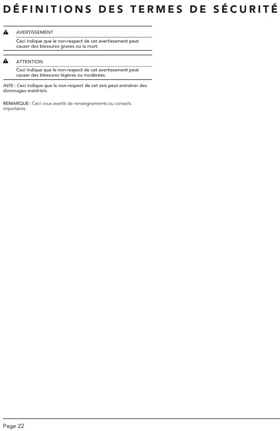 - Exclusion de garantie Page 22 DÉFINITIONS DES TERMES DE SÉCURITÉ AVERTISSEMENT Ceci indique que le non-respect de cet avertissement peut causer des blessures graves ou la mort. ATTENTION Ceci indique que le non-respect de cet avertissement peut causer des blessures légères ou modérées. AVIS : Ceci indique que le non-respect de cet avis peut entraîner des dommages matériels. REMARQUE : Ceci vous avertit de renseignements ou conseils importants.Page 23 p. 38