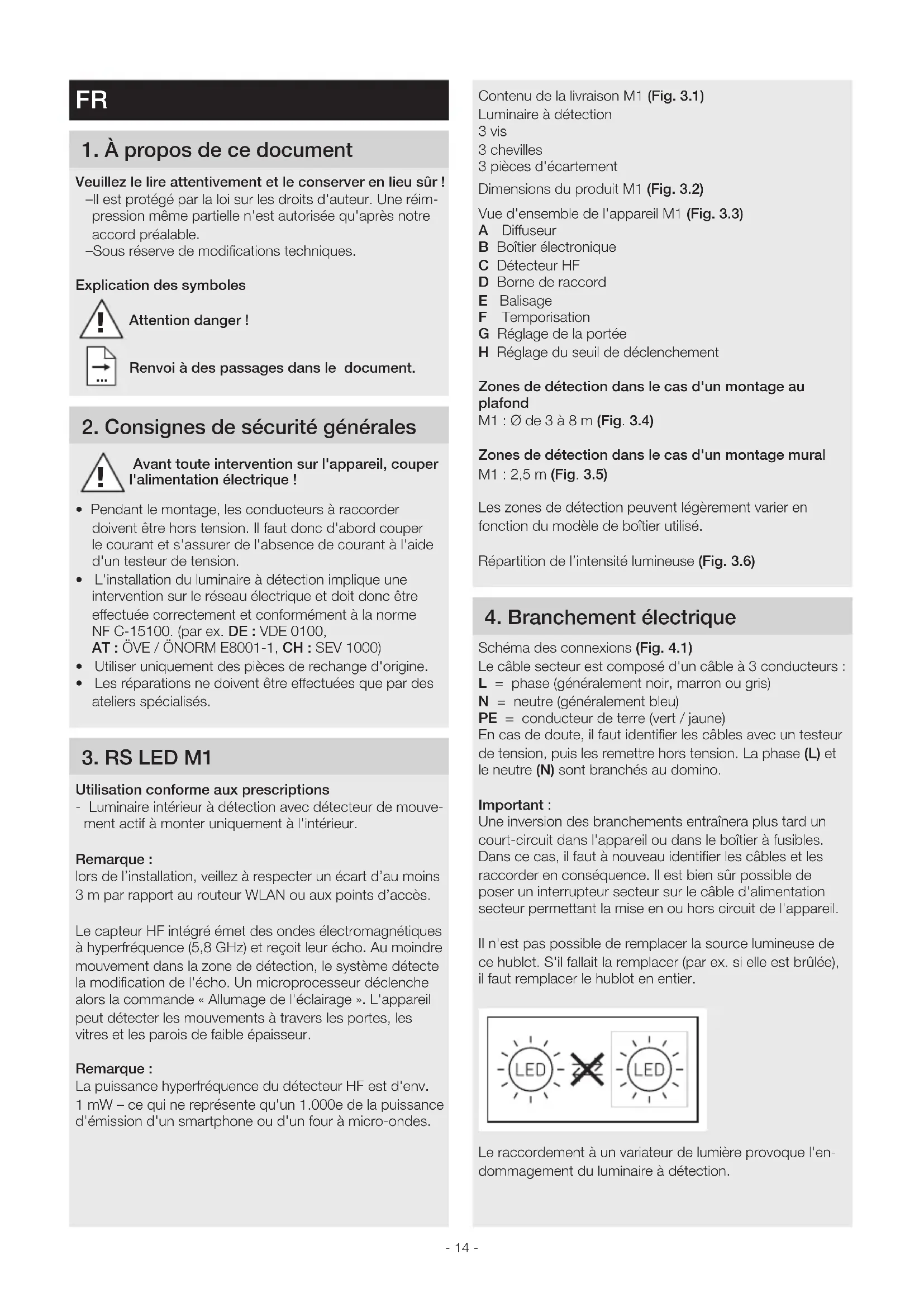 HF technology 5.8 GHz (responds to the slightest movement regardless of temperature) Angle of coverage 360° with 160° angle of aperture Transmitter power approx. 1mW Detection reach Ø 3 – 8 m Time setting 5 s – 15 min Twilight setting 2 – 2,000 lux Basic light level 10% IP rating IP20 Protection class II Ambient temperature -10°C to +40°C Energy efficiency class This product contains an energy efficiency class “F” light source.- 14 - Contenu de la livraison M1 (Fig.3.1) Luminaire à détection 3 vis 3 chevilles 3 pièces d'écartement Dimensions du produit M1 (Fig.3.2) Vue d'ensemble de l'appareil M1 (Fig.3.3) A Diuseur B Boîtier électronique C Détecteur HF D Borne de raccord E Balisage F Temporisation G Réglage de la portée H Réglage du seuil de déclenchement Zones de détection dans le cas d'un montage au plafond M1 : Ø de 3 à 8 m (Fig.3.4) Zones de détection dans le cas d'un montage mural M1 : 2,5 m (Fig.3.5) Les zones de détection peuvent légèrement varier en fonction du modèle de boîtier utilisé. Répartition de l’intensité lumineuse (Fig.3.6)