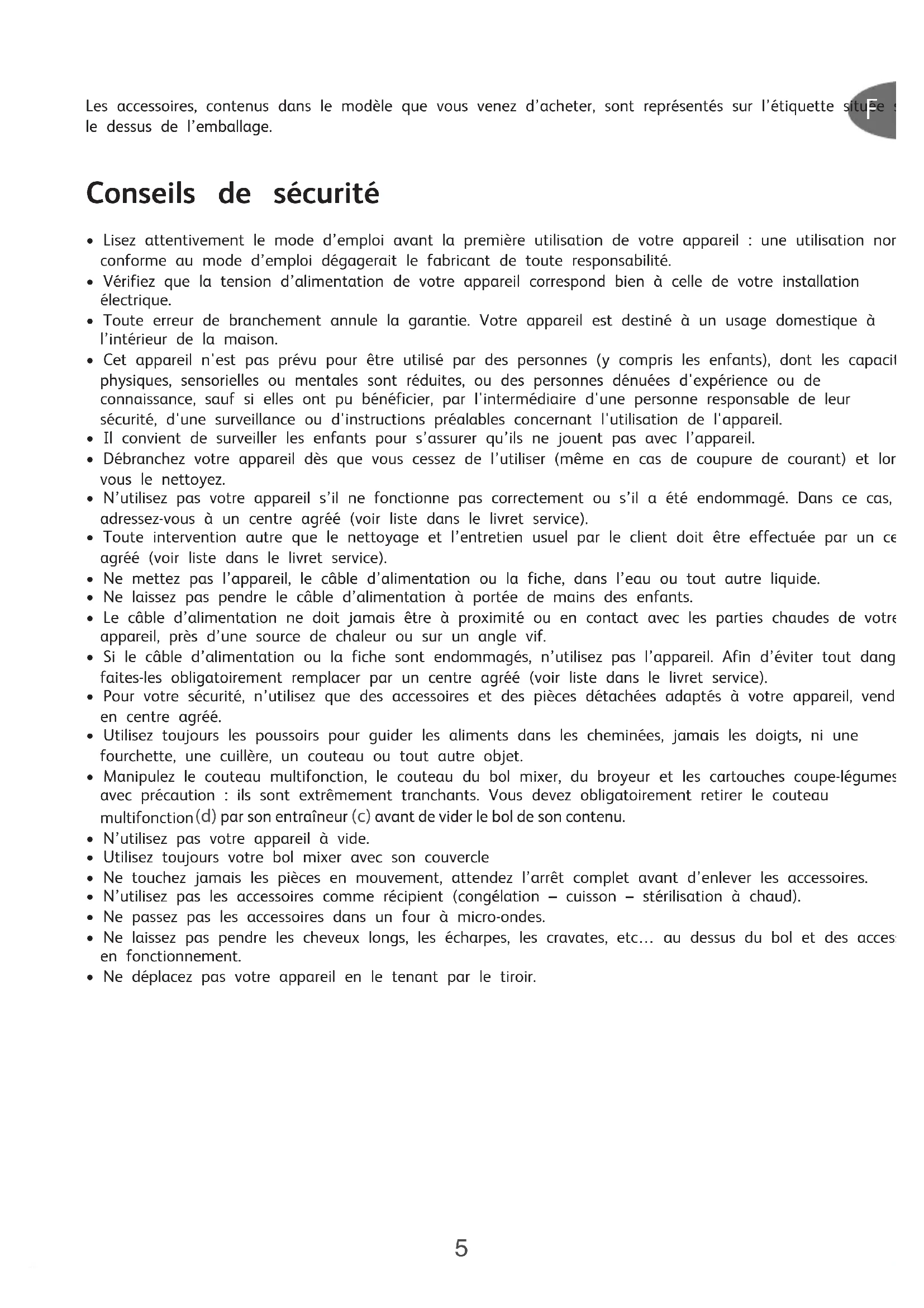 Les accessoires, contenus dans le modèle que vous venez d’acheter, sont représentés sur l’étiquette située sur le dessus de l’emballage. Conseils de sécurité