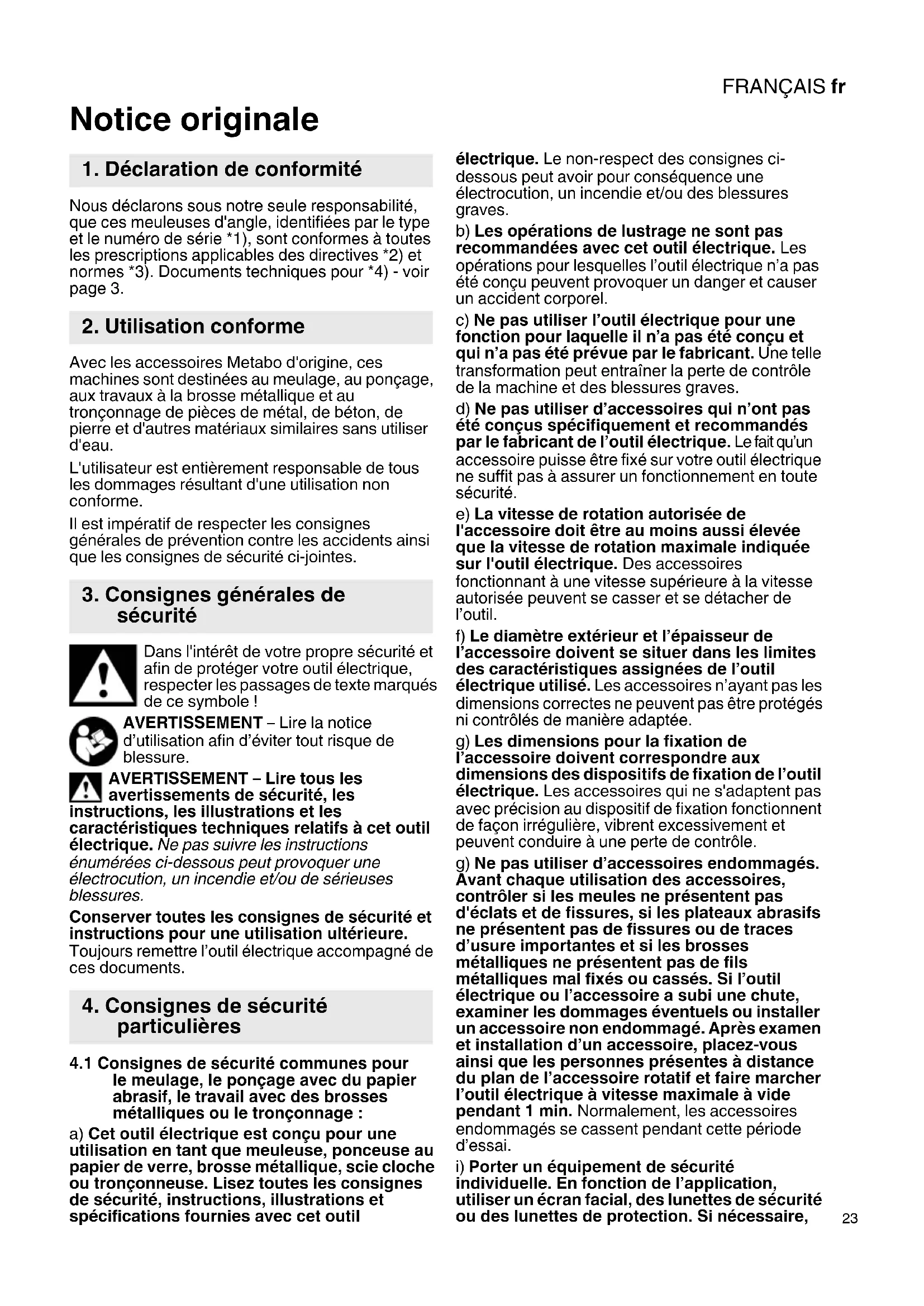 Notice originale Nous déclarons sous notre seule responsabilité, que ces meuleuses d'angle, identifiées par le type et le numéro de série *1), sont conformes à toutes les prescriptions applicables des directives *2) et normes *3). Documents techniques pour *4) - voir page 3. Avec les accessoires Metabo d'origine, ces machines sont destinées au meulage, au ponçage, aux travaux à la brosse métallique et au tronçonnage de pièces de métal, de béton, de pierre et d'autres matériaux similaires sans utiliser d'eau. L'utilisateur est entièrement responsable de tous les dommages résultant d'une utilisation non conforme. Il est impératif de respecter les consignes générales de prévention contre les accidents ainsi que les consignes de sécurité ci-jointes. Dans l'intérêt de votre propre sécurité et afin de protéger votre outil électrique, respecter les passages de texte marqués de ce symbole ! AVERTISSEMENT – Lire la notice d’utilisation afin d’éviter tout risque de blessure. AVERTISSEMENT – Lire tous les avertissements de sécurité, les instructions, les illustrations et les caractéristiques techniques relatifs à cet outil électrique. Ne pas suivre les instructions énumérées ci-dessous peut provoquer une électrocution, un incendie et/ou de sérieuses blessures. Conserver toutes les consignes de sécurité et instructions pour une utilisation ultérieure. Toujours remettre l’outil électrique accompagné de ces documents.