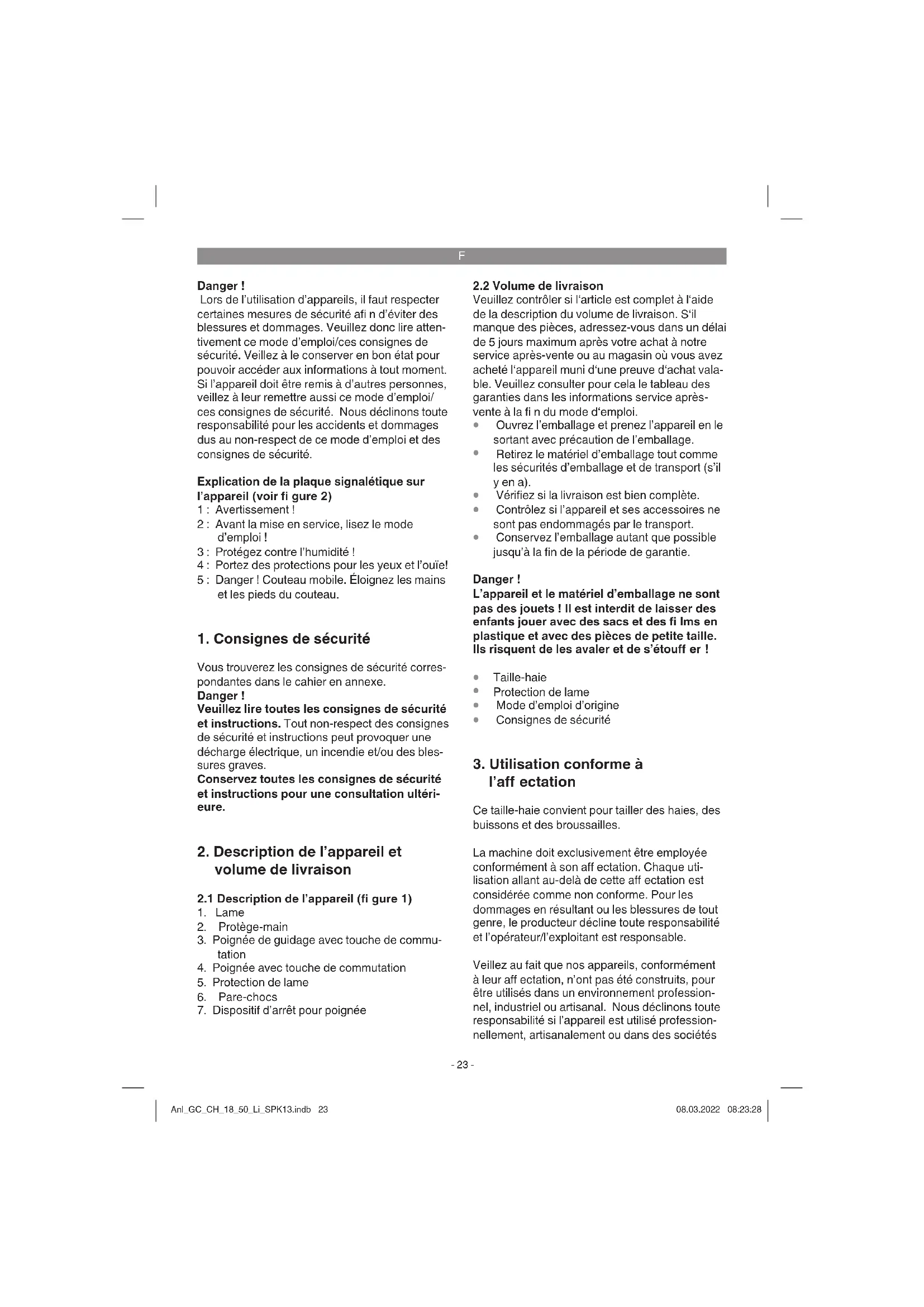 l’aff ectation Ce taille-haie convient pour tailler des haies, des buissons et des broussailles. La machine doit exclusivement être employée conformément à son aff ectation. Chaque uti- lisation allant au-delà de cette aff ectation est considérée comme non conforme. Pour les dommages en résultant ou les blessures de tout genre, le producteur décline toute responsabilité et l’opérateur/l’exploitant est responsable. Veillez au fait que nos appareils, conformément à leur aff ectation, n’ont pas été construits, pour être utilisés dans un environnement profession- nel, industriel ou artisanal. Nous déclinons toute responsabilité si l’appareil est utilisé profession- nellement, artisanalement ou dans des sociétés Anl_GC_CH_18_50_Li_SPK13.indb 23Anl_GC_CH_18_50_Li_SPK13.indb 23 08.03.2022 08:23:2808.03.2022 08:23:28F