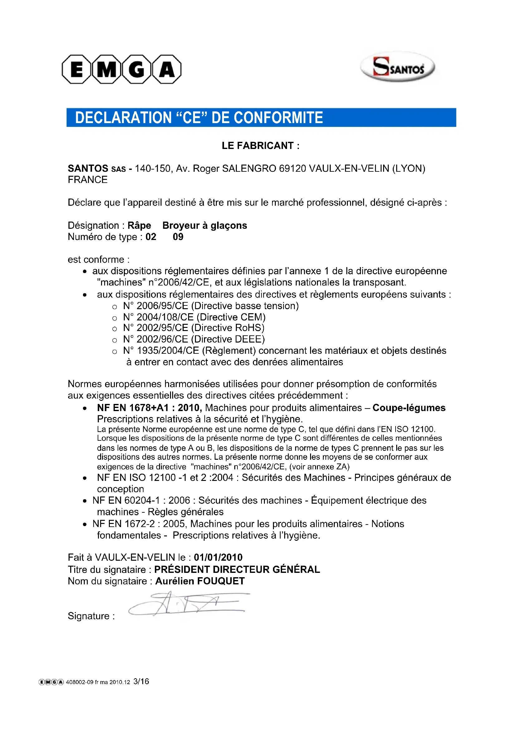 LE FABRICANT : SANTOS SAS - 140-150, Av. Roger SALENGRO 69120 VAULX-EN-VELIN (LYON) FRANCE Déclare que l’appareil destiné à être mis sur le marché professionnel, désigné ci-après : Désignation : Râpe Broyeur à glaçons Numéro de type : 02 09 est conforme : aux dispositions réglementaires définies par l’annexe 1 de la directive européenne "machines" n°2006/42/CE, et aux législations nationales la transposant. aux dispositions réglementaires des directives et règlements européens suivants : o N° 2006/95/CE (Directive basse tension) o N° 2004/108/CE (Directive CEM) o N° 2002/95/CE (Directive RoHS) o N° 2002/96/CE (Directive DEEE) o N° 1935/2004/CE (Règlement) concernant les matériaux et objets destinés à entrer en contact avec des denrées alimentaires Normes européennes harmonisées utilisées pour donner présomption de conformités aux exigences essentielles des directives citées précédemment : NF EN 1678+A1 : 2010, Machines pour produits alimentaires – Coupe-légumes Prescriptions relatives à la sécurité et l’hygiène. La présente Norme européenne est une norme de type C, tel que défini dans l’EN ISO 12100. Lorsque les dispositions de la présente norme de type C sont différentes de celles mentionnées dans les normes de type A ou B, les dispositions de la norme de types C prennent le pas sur les dispositions des autres normes. La présente norme donne les moyens de se conformer aux exigences de la directive "machines" n°2006/42/CE, (voir annexe ZA) NF EN ISO 12100 -1 et 2 :2004 : Sécurités des Machines - Principes généraux de conception NF EN 60204-1 : 2006 : Sécurités des machines - Équipement électrique des machines - Règles générales NF EN 1672-2 : 2005, Machines pour les produits alimentaires - Notions fondamentales - Prescriptions relatives à l’hygiène. Fait à VAULX-EN-VELIN le : 01/01/2010 Titre du signataire : PRÉSIDENT DIRECTEUR GÉNÉRAL Nom du signataire : Aurélien FOUQUET Signature : 408002-09 fr ma 2010.12 3/1698102 FR 5.1 - 12 2010 4 / 16 www.santos.fr