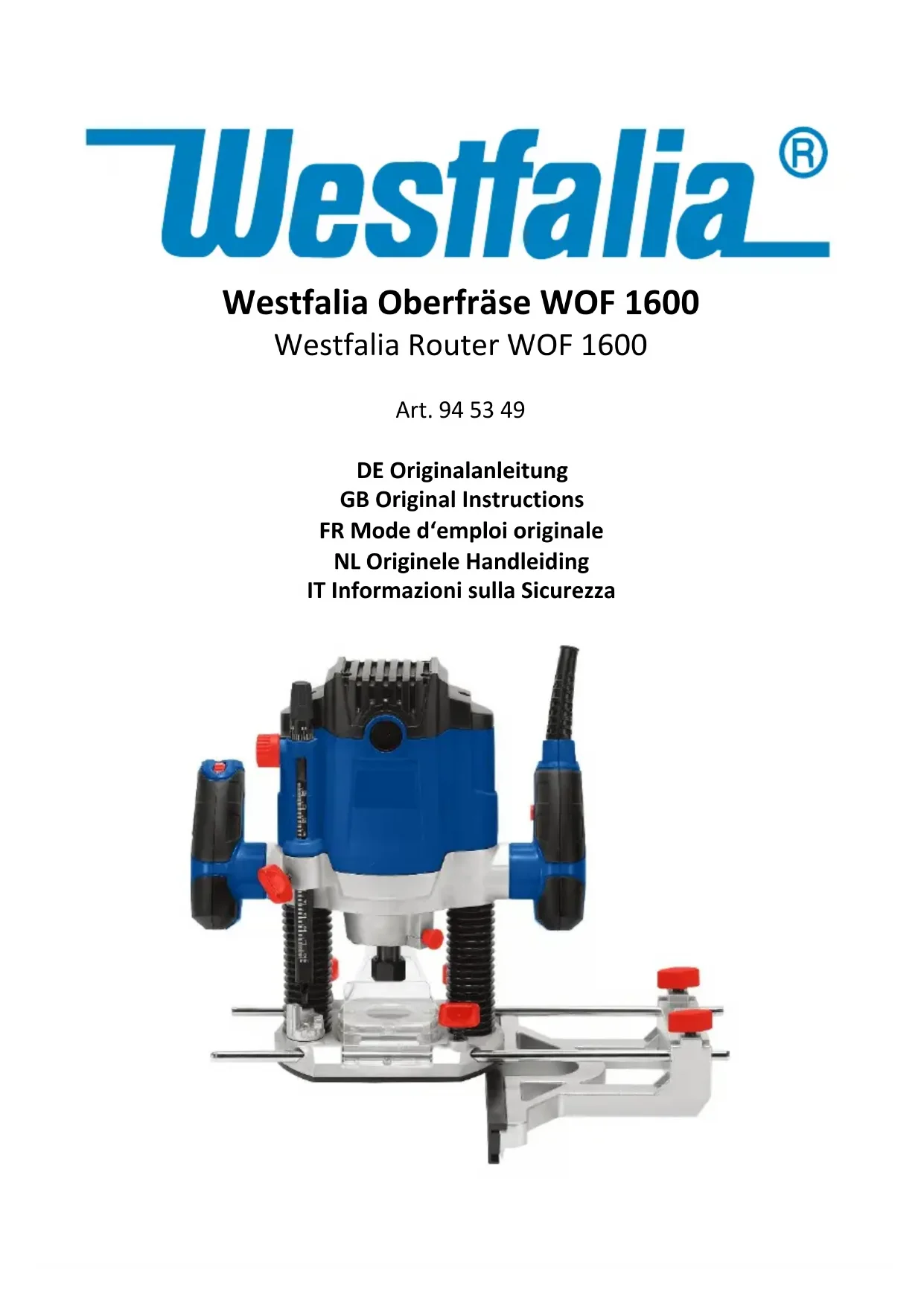 Téléchargez la notice de votre Fraiseuse au format PDF gratuitement ! Retrouvez votre notice WOF 1600 - Westfalia et reprennez votre appareil électronique en main. Sur cette page sont publiés tous les documents nécessaires à l'utilisation de votre appareil WOF 1600 de la marque Westfalia.