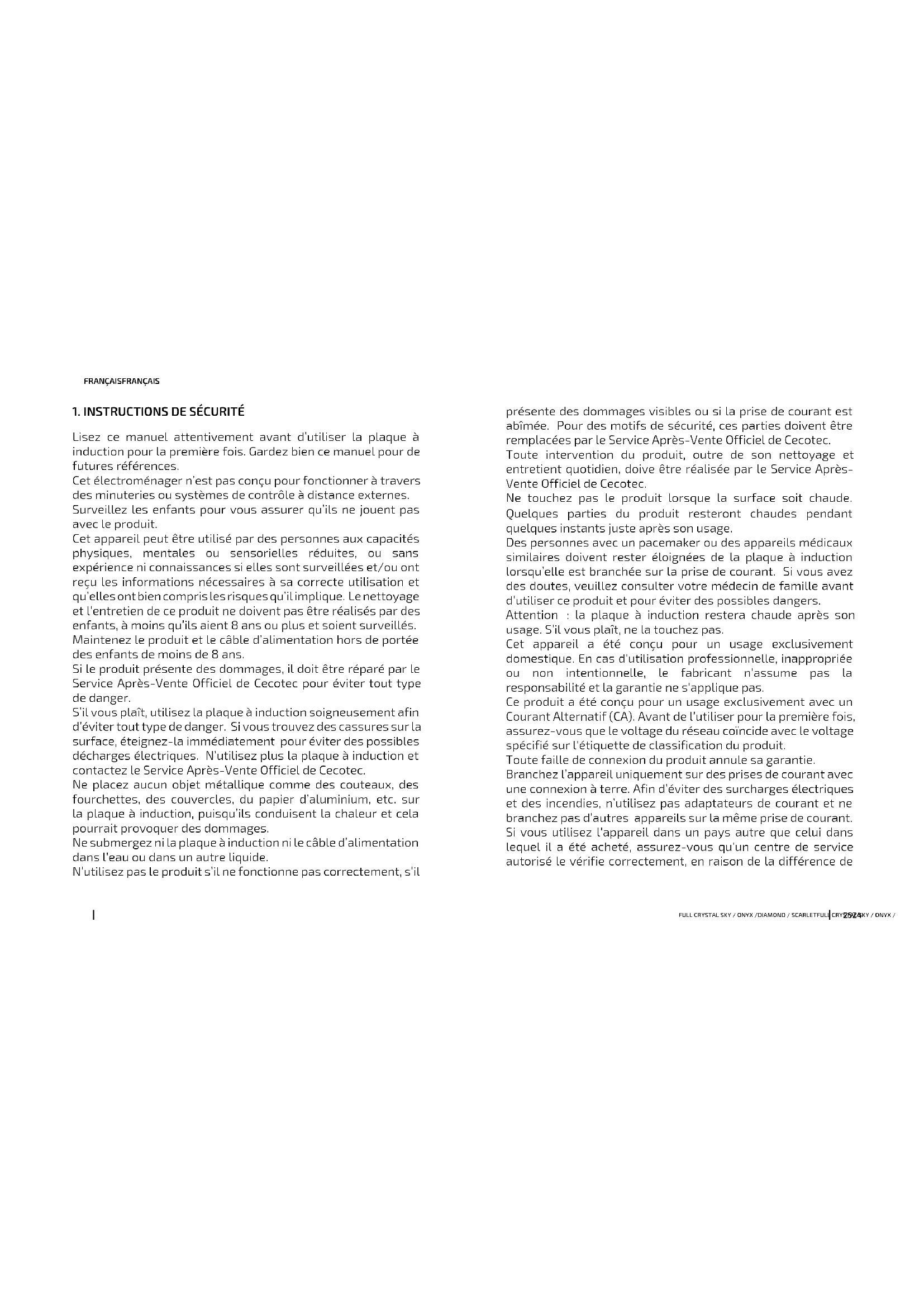 Lisez ce manuel attentivement avant d’utiliser la plaque à induction pour la première fois. Gardez bien ce manuel pour de futures références. Cet électroménager n’est pas conçu pour fonctionner à travers des minuteries ou systèmes de contrôle à distance externes. Surveillez les enfants pour vous assurer qu’ils ne jouent pas avec le produit. Cet appareil peut être utilisé par des personnes aux capacités physiques, mentales ou sensorielles réduites, ou sans expérience ni connaissances si elles sont surveillées et/ou ont reçu les informations nécessaires à sa correcte utilisation et qu’elles ont bien compris les risques qu’il implique. Le nettoyage et l’entretien de ce produit ne doivent pas être réalisés par des enfants, à moins qu’ils aient 8 ans ou plus et soient surveillés. Maintenez le produit et le câble d’alimentation hors de portée des enfants de moins de 8 ans. Si le produit présente des dommages, il doit être réparé par le Service Après-Vente Officiel de Cecotec pour éviter tout type de danger. S’il vous plaît, utilisez la plaque à induction soigneusement afin d’éviter tout type de danger. Si vous trouvez des cassures sur la surface, éteignez-la immédiatement pour éviter des possibles décharges électriques. N’utilisez plus la plaque à induction et contactez le Service Après-Vente Officiel de Cecotec. Ne placez aucun objet métallique comme des couteaux, des fourchettes, des couvercles, du papier d’aluminium, etc. sur la plaque à induction, puisqu’ils conduisent la chaleur et cela pourrait provoquer des dommages. Ne submergez ni la plaque à induction ni le câble d’alimentation dans l’eau ou dans un autre liquide. N’utilisez pas le produit s’il ne fonctionne pas correctement, s’il présente des dommages visibles ou si la prise de courant est abîmée. Pour des motifs de sécurité, ces parties doivent être remplacées par le Service Après-Vente Officiel de Cecotec. Toute intervention du produit, outre de son nettoyage et entretient quotidien, doive être réalisée par le Service Après- Vente Officiel de Cecotec. Ne touchez pas le produit lorsque la surface soit chaude. Quelques parties du produit resteront chaudes pendant quelques instants juste après son usage. Des personnes avec un pacemaker ou des appareils médicaux similaires doivent rester éloignées de la plaque à induction lorsqu’elle est branchée sur la prise de courant. Si vous avez des doutes, veuillez consulter votre médecin de famille avant d’utiliser ce produit et pour éviter des possibles dangers. Attention : la plaque à induction restera chaude après son usage. S’il vous plaît, ne la touchez pas. Cet appareil a été conçu pour un usage exclusivement domestique. En cas d'utilisation professionnelle, inappropriée ou non intentionnelle, le fabricant n’assume pas la responsabilité et la garantie ne s'applique pas. Ce produit a été conçu pour un usage exclusivement avec un Courant Alternatif (CA). Avant de l’utiliser pour la première fois, assurez-vous que le voltage du réseau coïncide avec le voltage spécifié sur l'étiquette de classification du produit. Toute faille de connexion du produit annule sa garantie. Branchez l’appareil uniquement sur des prises de courant avec une connexion à terre. Afin d’éviter des surcharges électriques et des incendies, n’utilisez pas adaptateurs de courant et ne branchez pas d’autres appareils sur la même prise de courant. Si vous utilisez l'appareil dans un pays autre que celui dans lequel il a été acheté, assurez-vous qu'un centre de service autorisé le vérifie correctement, en raison de la différence deFULL CRYSTAL SKY / ONYX /DIAMOND / SCARLETFULL CRYSTAL SKY / ONYX /DIAMOND / SCARLET