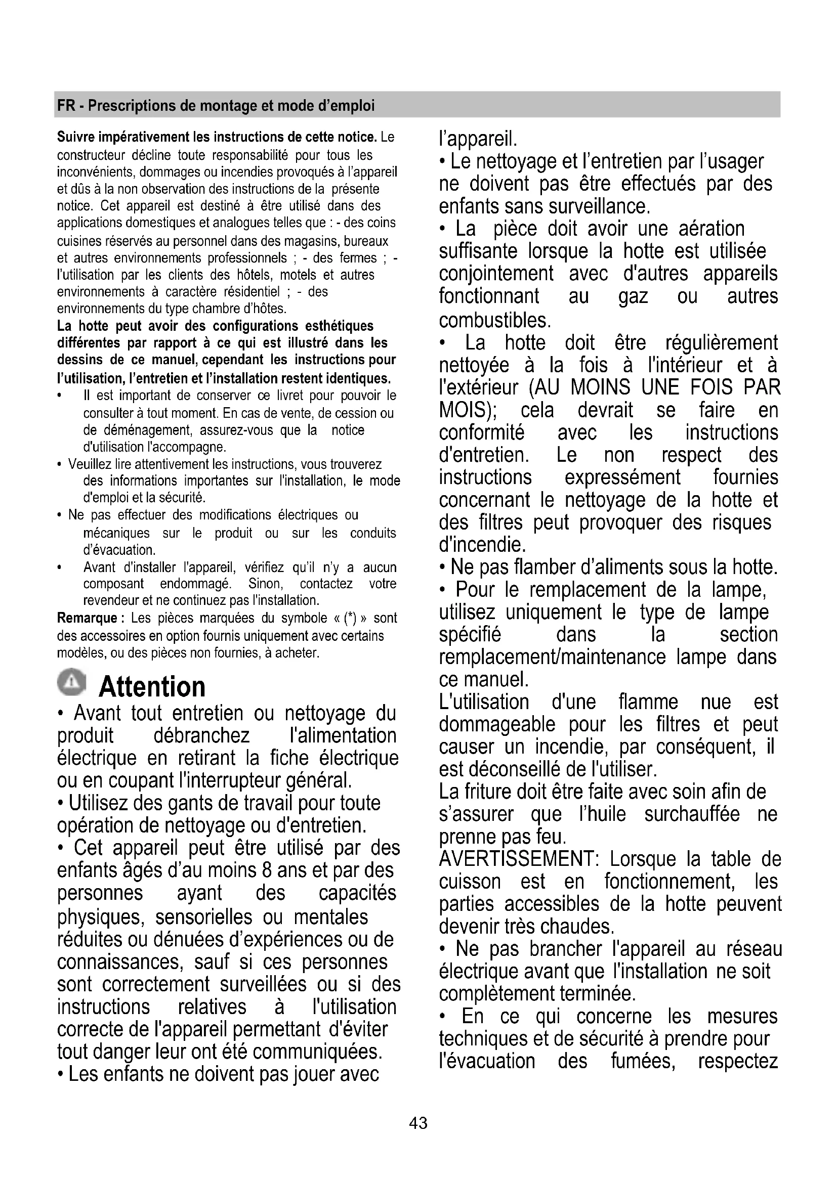 - La hotte ne doit JAMAIS être utilisée comme une surface d'appui, sauf indication expresse.