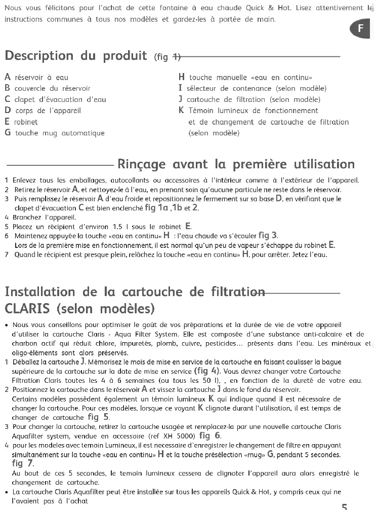 Notice Tefal BR 301141:Mise en page 1 19/03/07 15:34 Page 3Réf. 0827779 F p. 5 - 10 GB p. 11 - 16 D p. 17 - 22 NL p. 23 - 28 I p. 29 - 34 DK p. 35 - 40 S p. 41 - 46 N p. 47 - 52 FIN p. 53 - 57 Notice Tefal BR 301141:Mise en page 1 19/03/07 17:00 Page 58Nous vous félicitons pour l’achat de cette fontaine à eau chaude Quick & Hot. Lisez attentivement les instructions communes à tous nos modèles et gardez-les à portée de main. Description du produit (fig 1) Rinçage avant la première utilisation 1 Enlevez tous les emballages, autocollants ou accessoires à l’intérieur comme à l’extérieur de l’appareil. 2 Retirez le réservoir A, et nettoyez-le à l’eau, en prenant soin qu’aucune particule ne reste dans le réservoir. 3 Puis remplissez le réservoir A d’eau froide et repositionnez le fermement sur sa base D, en vérifiant que le clapet d’évacuation C est bien enclenché fig 1a ,1b et 2. 4 Branchez l’appareil. 5 Placez un récipient d’environ 1.5 l sous le robinet E. 6 Maintenez appuyée la touche «eau en continu» H : l’eau chaude va s’écouler fig 3. Lors de la première mise en fonctionnement, il est normal qu’un peu de vapeur s’échappe du robinet E. 7 Quand le récipient est presque plein, relâchez la touche «eau en continu» H, pour arrêter. Jetez l’eau. Installation de la cartouche de filtration CLARIS (selon modèles)