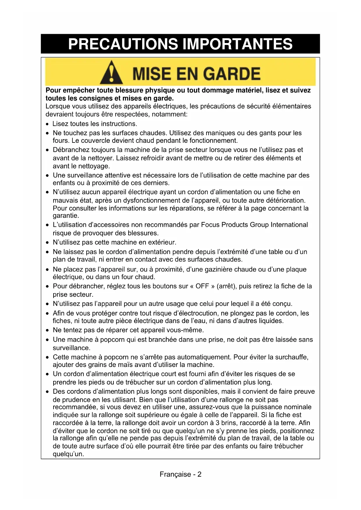- L’utilisation d’accessoires non recommandés par Focus Products Group International risque de provoquer des blessures.