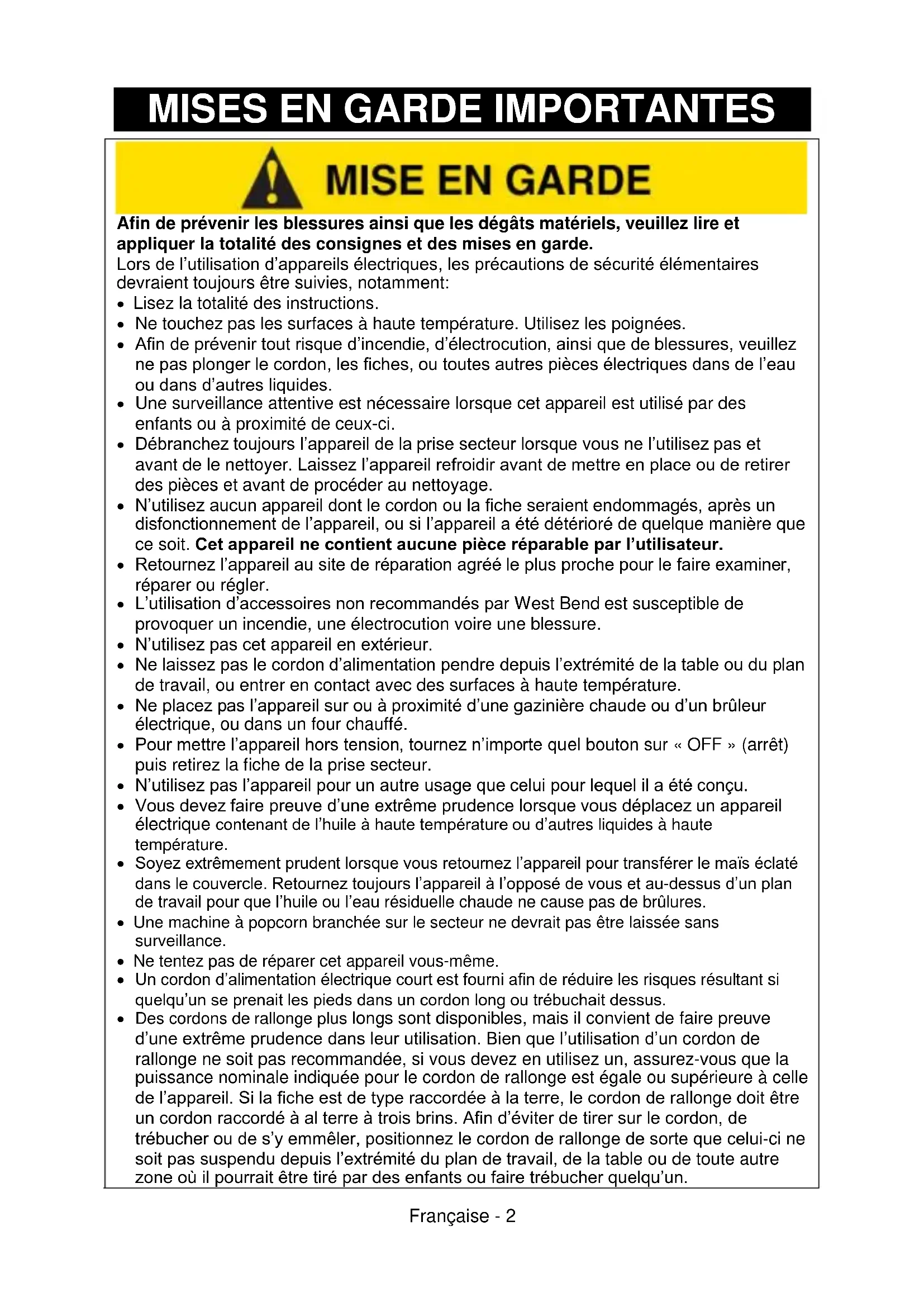 - L’utilisation d’accessoires non recommandés par West Bend est susceptible de provoquer un incendie, une électrocution voire une blessure.