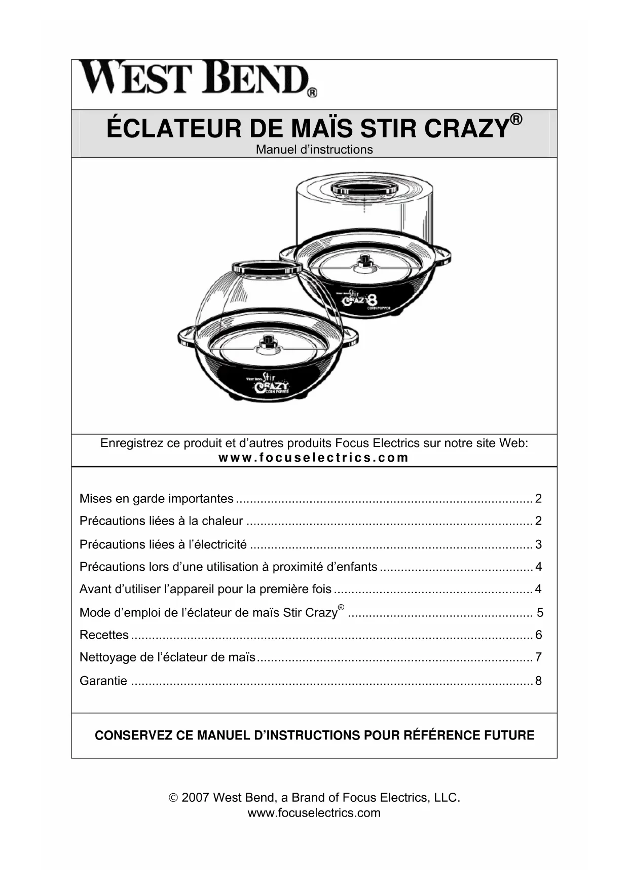 © 2007 West Bend, a Brand of Focus Electrics, LLC. www.focuselectrics.comMISES EN GARDE IMPORTANTES Pour écarter tout risque de blessure et de dégâts matériels, lisez et suivez toutes ces instructions et tous ces avertissements. Lorsque vous utilisez des appareils électriques, prenez toujours les précautions de base, notamment :