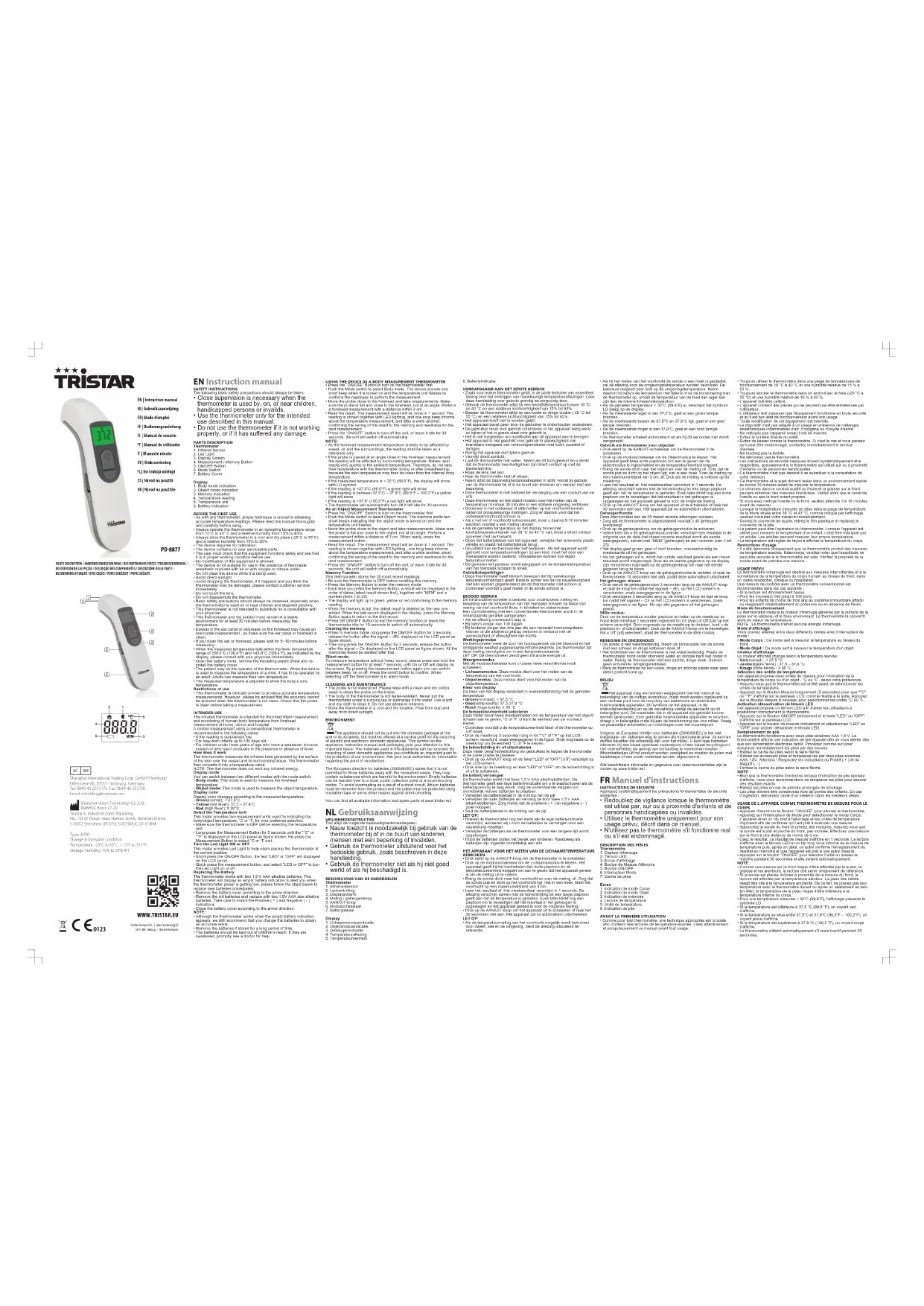 Téléchargez la notice de votre Thermomètre au format PDF gratuitement ! Retrouvez votre notice PD8877 - TRISTAR et reprennez votre appareil électronique en main. Sur cette page sont publiés tous les documents nécessaires à l'utilisation de votre appareil PD8877 de la marque TRISTAR.