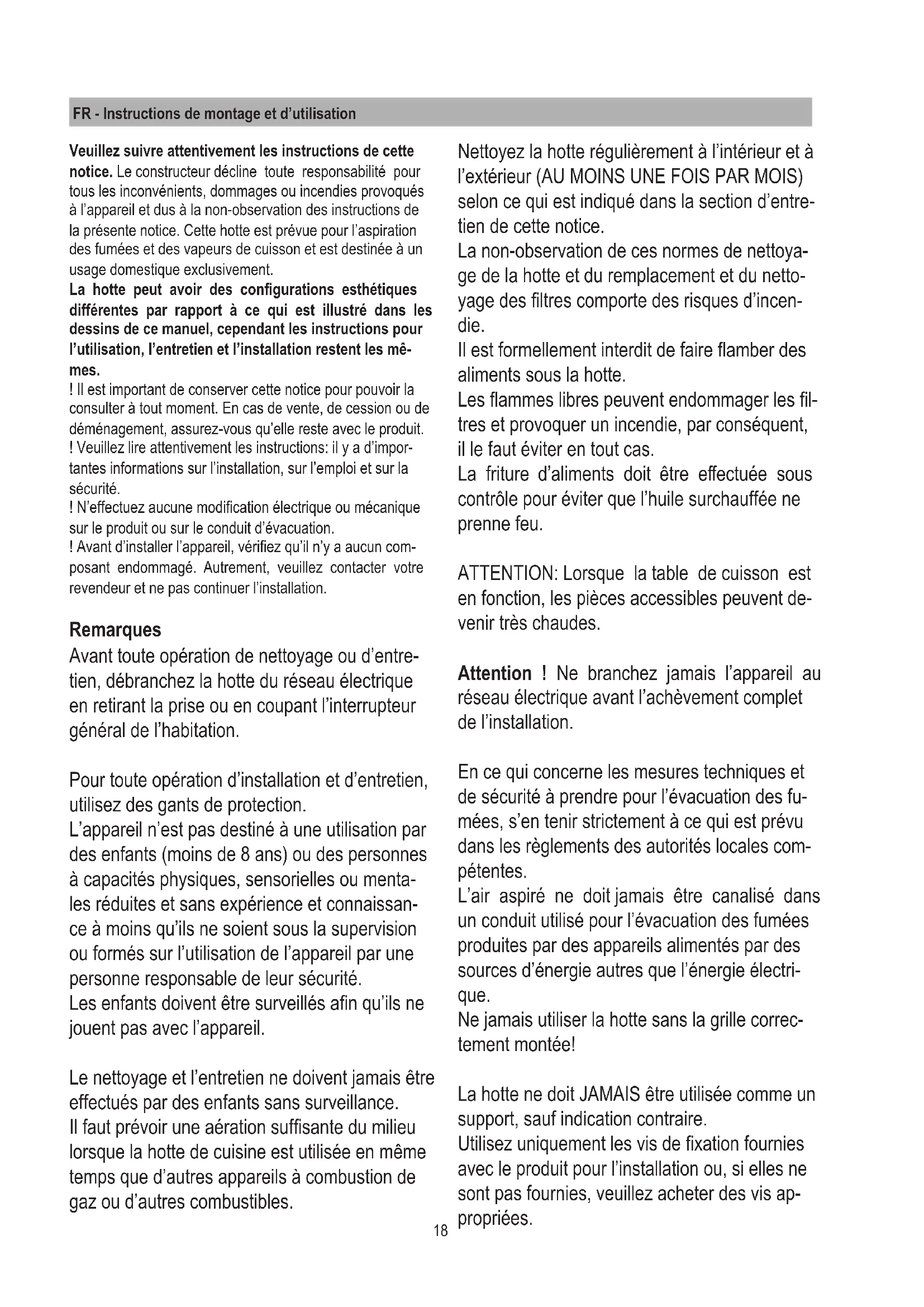- Den Elektrokasten mit den elektronischen Bauelementen für eventuelle Wartungseingriffe an einen einfach zugänglichen Ort stellen und die Steckverbinder an die Dunstabzugshaube anschließen (Abb. 11). Funktionsweise Für die normale Funktionsweise der Dunstab- zugshaube den Downdraft wie folgt öffnen. Der Downdraft öffnet sich, indem Sie das Glas nach unter schieben (Abb. 12). Nach Öffnung des Downdrafts den Absaugmo- tor am Bedienungsfeld einschalten. Bzw. schließt sich der Downdraft, indem Sie das Glas nach unten schieben, bis zur komplet- ten Schließung. T1. T2. T3. ON/OFF- und Timer-Taste: um die automatische Ausschaltung einzustellen Leistungsstufe 1: 20 Minuten Leistungsstufe 2: 15 Minuten Leistungsstufe 3: 10 Minuten Intensive Leistungsstufe: 5 Minuten Taste, um die Leistungsstufe zu verringern OFF 1: mehrmals betätigen, um die Leistungsstufe zu reduzieren bis Ausschaltung OFF 2: während aller Leistungsstufen lange betätigen ON-Taste, um die Leistungsstufe zu erhöhen (1-2-3-Intensiv). Die intensive Leistungsstufe schaltet nach 5 Minuten automatisch auf Leistungsstufe 2 zurück.17 Filtersättigungsanzeige Die Filtersättigungsanzeige zeigt Ihnen, wann Sie die Filter Ihrer Dunstabzugshaube wechseln bzw. reinigen sollten: Fettlter (nach za. 40 Stunden Betrieb): alle LEDs leuchten blau auf. Aktivkohlelter gegen Gerüche (nach za. 160 Stunden Betrieb): alle LEDs leuchten blau auf, LED L2 und L3 blin- ken. Reset der Filtersättigung Nach Wartung der Filter die Tasten T1 und T3 lange betäti- gen; die LEDs L1, L2 und L3 blinken kurz blau und er- leuchten dann denitiv. Aktivierung der Aktivkohlelter-Sättigungsanzeige. Diese Anzeige ist normalerweise deaktiviert. Zur Aktivie- rung gehen Sie bitte wie folgt vor: Bei ausgeschalteter Dunstabzugshaube die Tasten T1 und T2 gleichzeitig lange betätigen: zuerst leuchtet L1 dann L2 und L3 auf. Nach loslassen der Tasten blinken kurz die LEDs L2 und L3 zur Bestätigung. Deaktivierung der Aktivkohlelter-Sättigungsanzeige Den oben erwähnten Vorgang wiederholen: L1, L2 und L3 leuchten gleichzeitig auf. Nach loslassen der Tasten er- leuchten die LEDs L2 und L3 zur Bestätigung. WARTUNG Fettlter Der Fettlter entzieht den entstehenden Kochdämpfen Fett. Der Filter muss einmal pro Monat gereinigt werden (oder wenn die Filtersättigungsanzeige – falls vorgesehen – dies anzeigt), mit milden Waschmittel, per Hand oder in der Spülmaschine bei niedriger Temperatur und einem Kurz- spülgang erfolgen. Der Metallfettlter kann bei der Reinigung in der Spülma- schine verfärben, was seine Filtermerkmale jedoch in kei- ner Weise beeinträchtigt. Aktivkohlelter (nur bei Umluftbetrieb) Dieser Filter entfernt sofort unangenehme Gerüche, die beim Kochen entstehen. Die Sättigung des Aktivkohlelters hängt vom Gebrauch, von den Kochgewohnheiten und der Fettlterreinigung ab. Jedenfalls muss der Filter alle vier Monate gewechselt werden. Nach Entfernung der Fettlter, die Aktivkohlelter einsetzen (Abb. 8).18 FR - Instructions de montage et d’utilisation Veuillez suivre attentivement les instructions de cette notice. Le constructeur décline toute responsabilité pour tous les inconvénients, dommages ou incendies provoqués à l’appareil et dus à la non-observation des instructions de la présente notice. Cette hotte est prévue pour l’aspiration des fumées et des vapeurs de cuisson et est destinée à un usage domestique exclusivement. La hotte peut avoir des congurations esthétiques différentes par rapport à ce qui est illustré dans les dessins de ce manuel, cependant les instructions pour l’utilisation, l’entretien et l’installation restent les mê- mes. ! Il est important de conserver cette notice pour pouvoir la consulter à tout moment. En cas de vente, de cession ou de déménagement, assurez-vous qu’elle reste avec le produit. ! Veuillez lire attentivement les instructions: il y a d’impor- tantes informations sur l’installation, sur l’emploi et sur la sécurité. ! N’effectuez aucune modication électrique ou mécanique sur le produit ou sur le conduit d’évacuation. ! Avant d’installer l’appareil, vériez qu’il n’y a aucun com- posant endommagé. Autrement, veuillez contacter votre revendeur et ne pas continuer l’installation. Remarques Avant toute opération de nettoyage ou d’entre- tien, débranchez la hotte du réseau électrique en retirant la prise ou en coupant l’interrupteur général de l’habitation. Pour toute opération d’installation et d’entretien, utilisez des gants de protection. L’appareil n’est pas destiné à une utilisation par des enfants (moins de 8 ans) ou des personnes à capacités physiques, sensorielles ou menta- les réduites et sans expérience et connaissan- ce à moins qu’ils ne soient sous la supervision ou formés sur l’utilisation de l’appareil par une personne responsable de leur sécurité. Les enfants doivent être surveillés an qu’ils ne jouent pas avec l’appareil. Le nettoyage et l’entretien ne doivent jamais être effectués par des enfants sans surveillance. Il faut prévoir une aération sufsante du milieu lorsque la hotte de cuisine est utilisée en même temps que d’autres appareils à combustion de gaz ou d’autres combustibles. Nettoyez la hotte régulièrement à l’intérieur et à l’extérieur (AU MOINS UNE FOIS PAR MOIS) selon ce qui est indiqué dans la section d’entre- tien de cette notice. La non-observation de ces normes de nettoya- ge de la hotte et du remplacement et du netto- yage des ltres comporte des risques d’incen- die. Il est formellement interdit de faire amber des aliments sous la hotte. Les ammes libres peuvent endommager les l- tres et provoquer un incendie, par conséquent, il le faut éviter en tout cas. La friture d’aliments doit être effectuée sous contrôle pour éviter que l’huile surchauffée ne prenne feu. ATTENTION: Lorsque la table de cuisson est en fonction, les pièces accessibles peuve