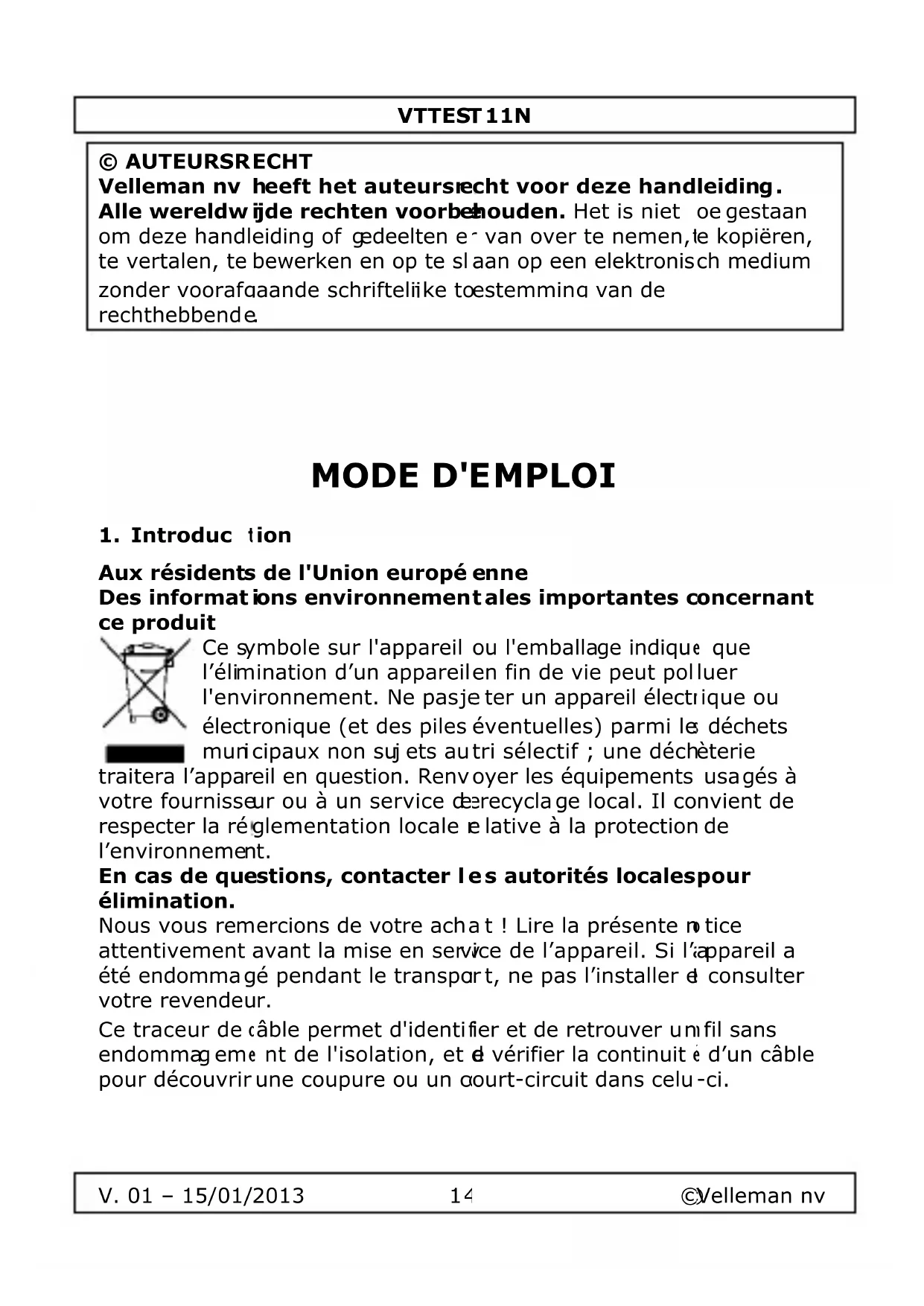 Retrouvez gratuitement la notice de l'appareil VTTEST11N VELLEMAN au format PDF.