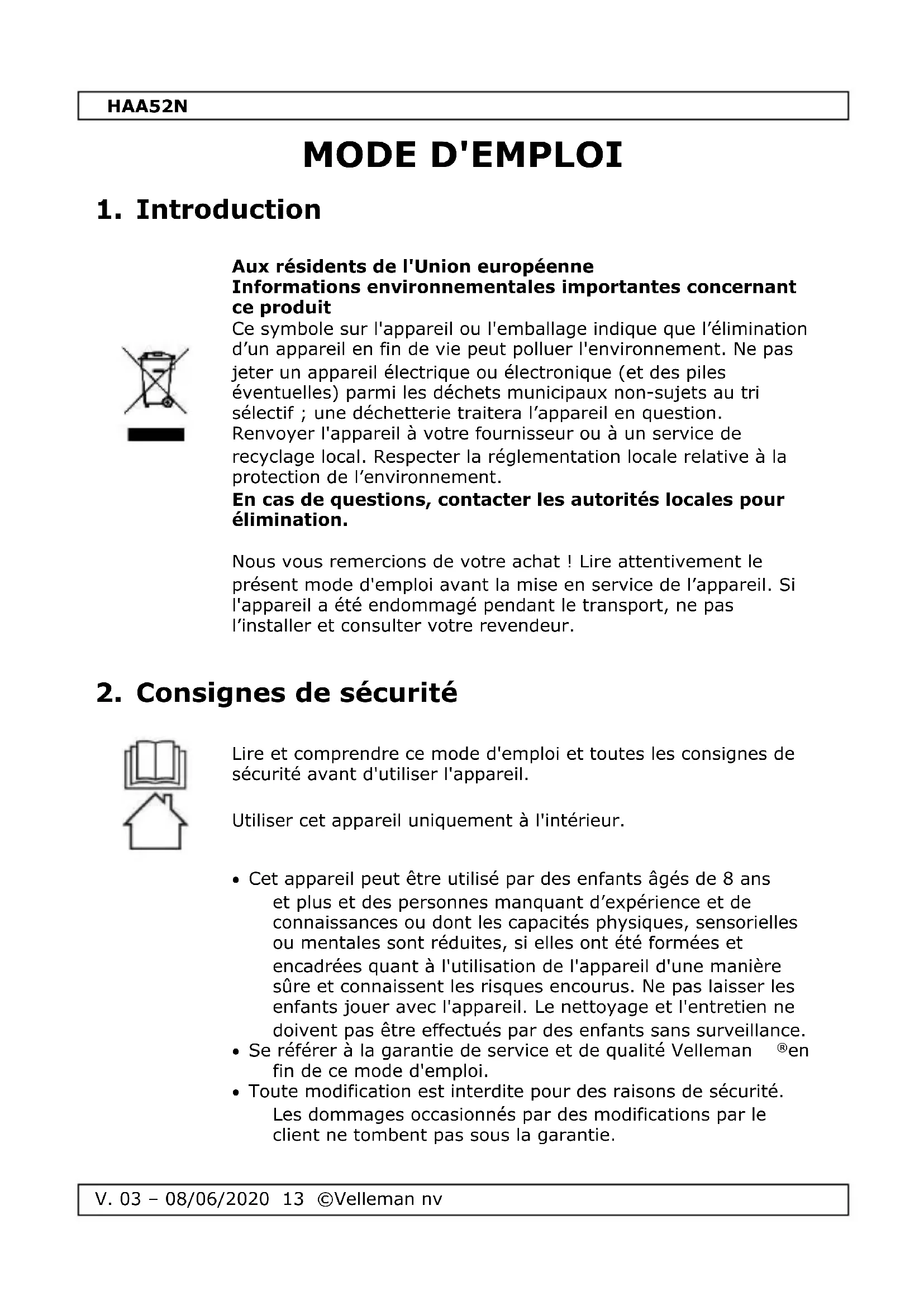 Velleman SA est l’ayant droit des droits d’auteur de ce mode d'emploi. Tous droits mondiaux réservés. Toute reproduction, traduction, copie ou diffusion, intégrale ou partielle, du contenu de ce mode d'emploi par quelque procédé ou sur tout support électronique que ce soit est interdite sans l’accord préalable écrit de l’ayant droit.HAA52N