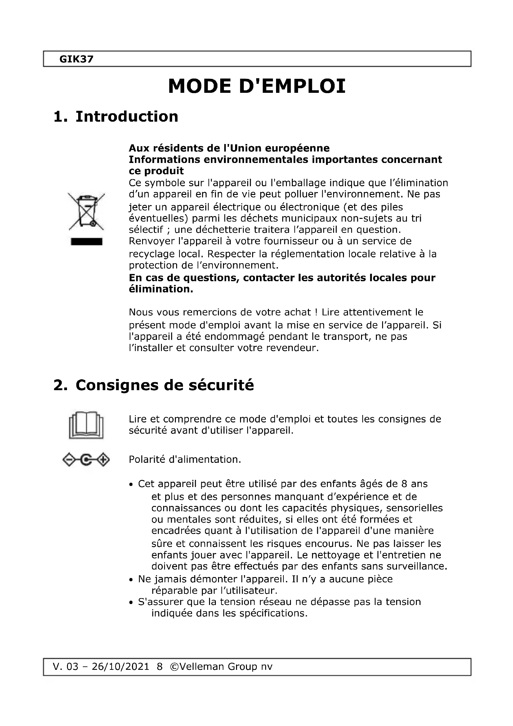 Velleman Group nv est l’ayant droit des droits d’auteur de ce mode d'emploi. Tous droits mondiaux réservés. Toute reproduction, traduction, copie ou diffusion, intégrale ou partielle, du contenu de ce mode d'emploi par quelque procédé ou sur tout support électronique que ce soit est interdite sans l’accord préalable écrit de l’ayant droit.GIK37