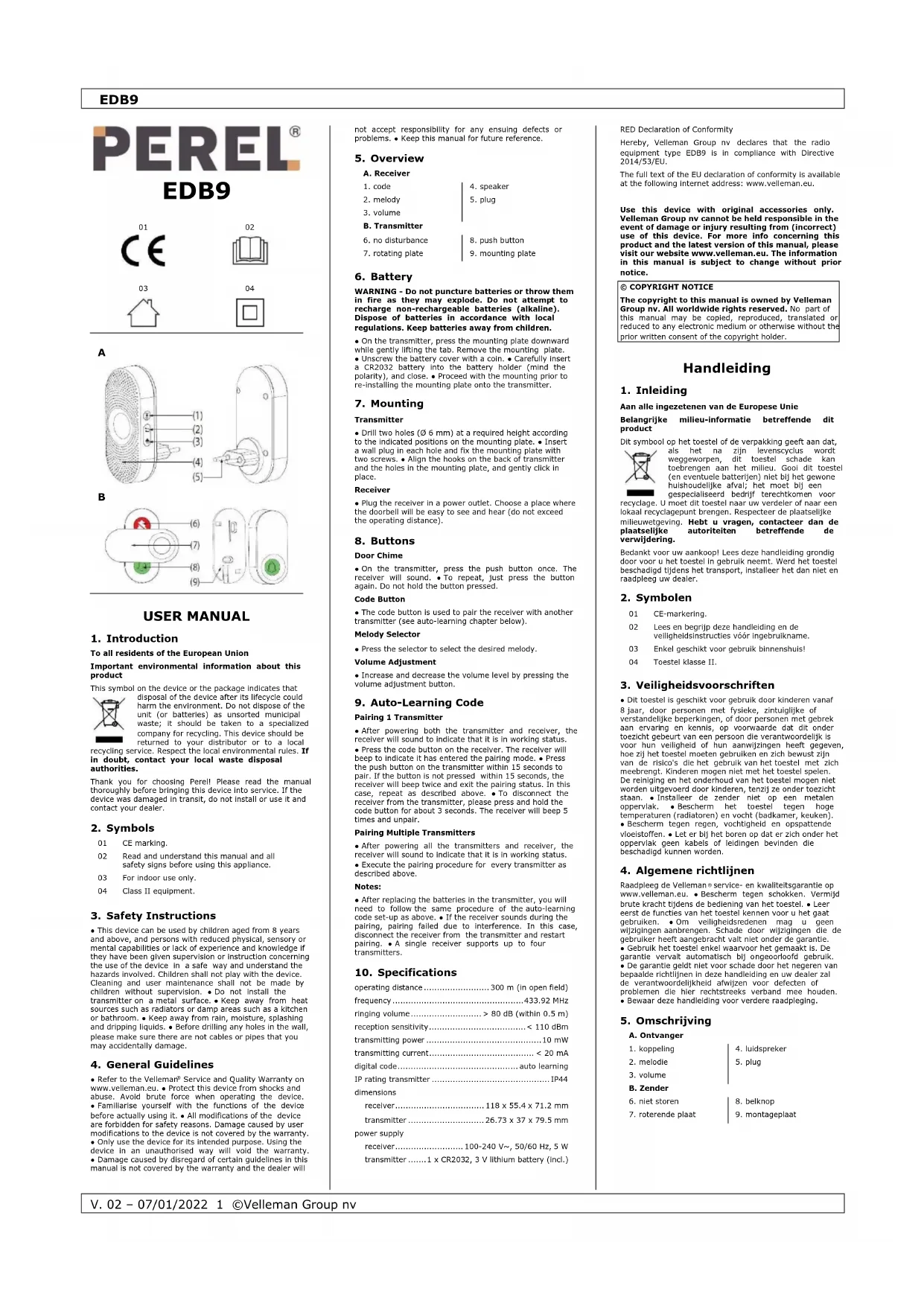 portée ....................................... 300 m (sans obstacles) fréquence .................................................. 433.92 MHz volume .................................... > 80 dB (jusqu'à 0.5 m) sensibilité de réception ................................. < 110 dBm puissance de transmission .................................. 10 mW courant de transmission .................................. < 20 mA code numérique ............................... auto-apprentissage valeur IP émetteur................................................ IP44 dimensions récepteur................................ 118 x 55.4 x 71.2 mm émetteur ................................ 26.73 x 37 x 79.5 mm alimentation récepteur........................ 100-240 V~, 50/60 Hz, 5 W émetteur ....... 1 x pile au lithium CR2032 de 3 V (incl.) Déclaration de conformité RED Par la présente, Velleman Group SA, déclare que le type d'équipement [EDB9] est conforme à la norme 2014/53/EC. Le texte complet de la déclaration de conformité est disponible sur la page web suivante : www.velleman.eu. N'employer cet appareil qu’avec des accessoires d’origine. Velleman Group SA ne peut, dans la mesure conforme au droit applicable être tenue responsable des dommages ou lésions (directs ou indirects) pouvant résulter de l’utilisation de cet appareil. Pour plus d'informations concernant cet article et la dernière version de ce mode d'emploi, consulter notre site www.velleman.eu. Les spécifications et le continu de ce mode d'emploi peuvent être modifiés sans notification préalable.