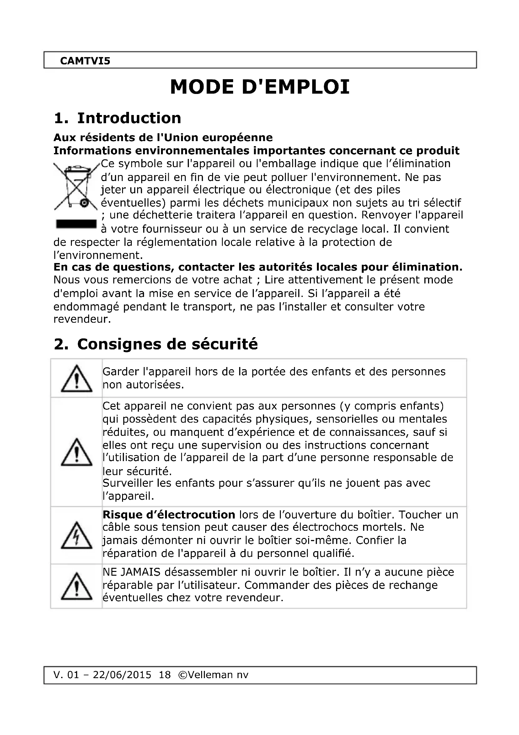 Retrouvez gratuitement la notice de l'appareil CAMTVI5 VELLEMAN au format PDF.