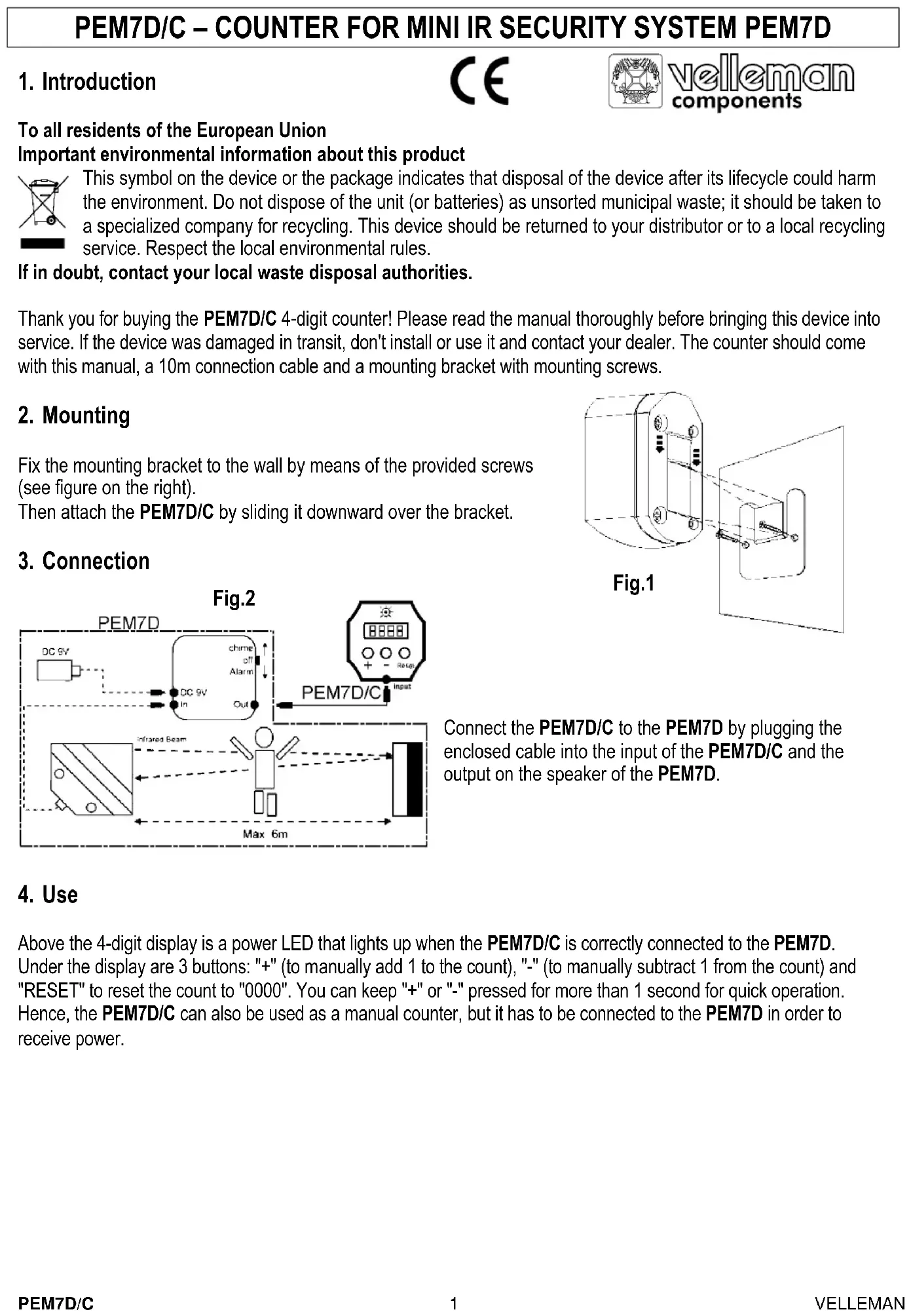 Alimentation 9-15Vcc Température ambiante -25°C~45°C Dimensions (LaxHxP) 58 x 67 x 24mm Ecran 4 digits rouges Consommation de courant voir table à la p.1 Toutes les informations présentées dans ce manuel peuvent être modifiées sans notification préalable.PEM7D/C 4 VELLEMAN PEM7D/C – CONTADOR PARA EL SISTEMA DE PROTECCIÓN IR EN MINIATURA PEM7D