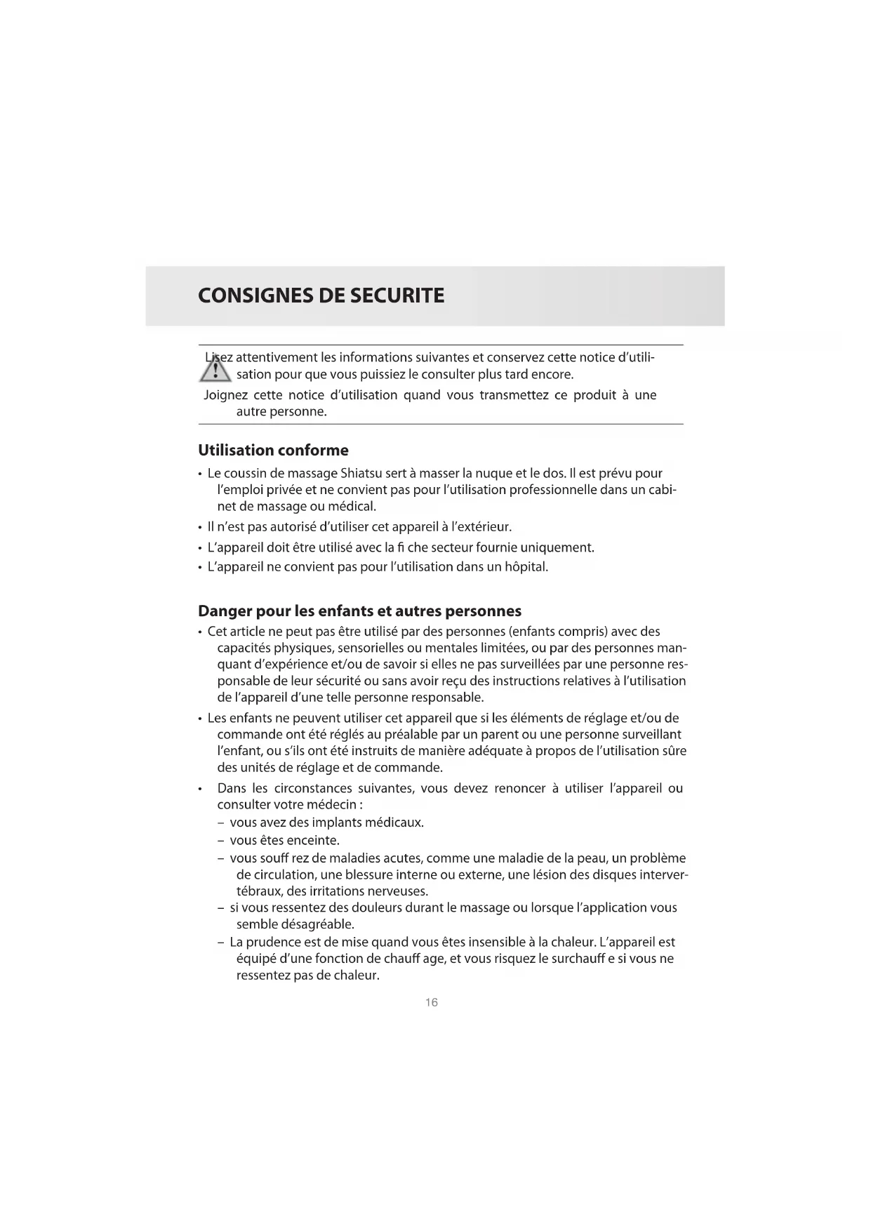 - Dans les circonstances suivantes, vous devez renoncer à utiliser l’appareil ou consulter votre médecin : – vous avez des implants médicaux. – vous êtes enceinte. – vous sou rez de maladies acutes, comme une maladie de la peau, un problème de circulation, une blessure interne ou externe, une lésion des disques interver- tébraux, des irritations nerveuses. – si vous ressentez des douleurs durant le massage ou lorsque l’application vous semble désagréable. – La prudence est de mise quand vous êtes insensible à la chaleur. L’appareil est équipé d’une fonction de chau age, et vous risquez le surchau e si vous ne ressentez pas de chaleur.
