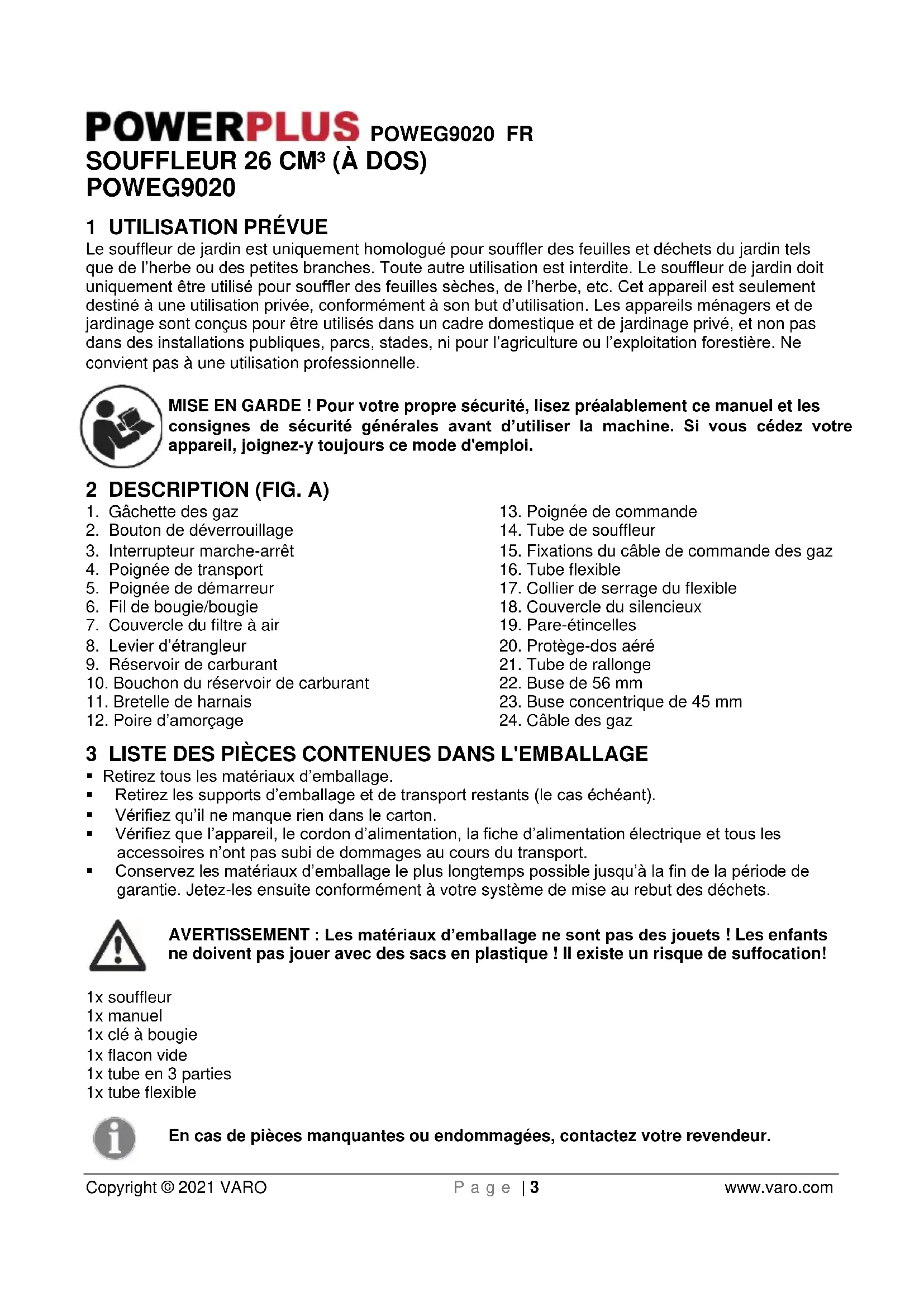 VARO – Vic. Van Rompuy N.V. - Joseph Van Instraat 9 - BE2500 Lier - BELGIQUE, déclare que : Appareil : SOUFFLEUR 26 CM³ (à dos) Marque : PowerPlus Modèle : POWEG9020 est en conformité avec les exigences essentielles et les autres dispositions pertinentes des Directives européennes applicables, basées sur l'application des normes européennes harmonisées. Toute modification non autorisée de l'appareil annule cette déclaration. Directives européennes (y compris, le cas échéant, leurs amendements à la date de la signature) : 2006/42/EC 2014/30/EU 2000/14/EC Annexe V LwA Mesurés 106dB(A) Garantis 107dB(A) Normes européennes harmonisées (y compris, le cas échéant, leurs amendements à la date de la signature) : EN15503 : 2009 – A2 EN ISO 14982 : 2009 Détenteur de la Documentation technique : Philippe Vankerkhove, VARO – Vic. Van Rompuy N.V. Le soussigné agit au nom du PDG de l'entreprise, Philippe Vankerkhove Réglementation – Directeur de la conformité 02/08/21, Lier – BelgiumPOWEG9020 EN Copyright © 2021 VARO P a g e | 1 www.varo.com 1 INTENDED USE ........................................................................................... 3