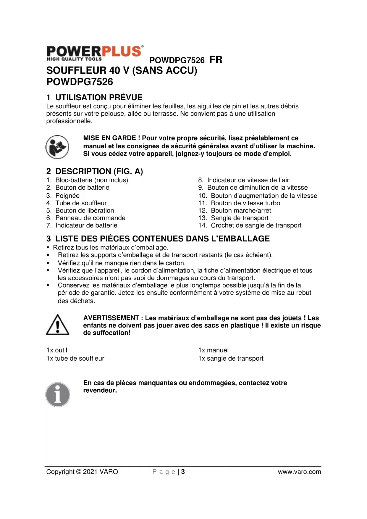 enfants ne doivent pas jouer avec des sacs en plastique ! Il existe un risque de suffocation! 1x outil 1x tube de souffleur 1x manuel 1x sangle de transport En cas de pièces manquantes ou endommagées, contactez votre revendeur.POWDPG7526 FR Copyright © 2021 VARO P a g e | 4 www.varo.com 4 PICTOGRAMMES Les symboles suivants sont utilisés dans ce mode d’emploi et/ou sur la machine: