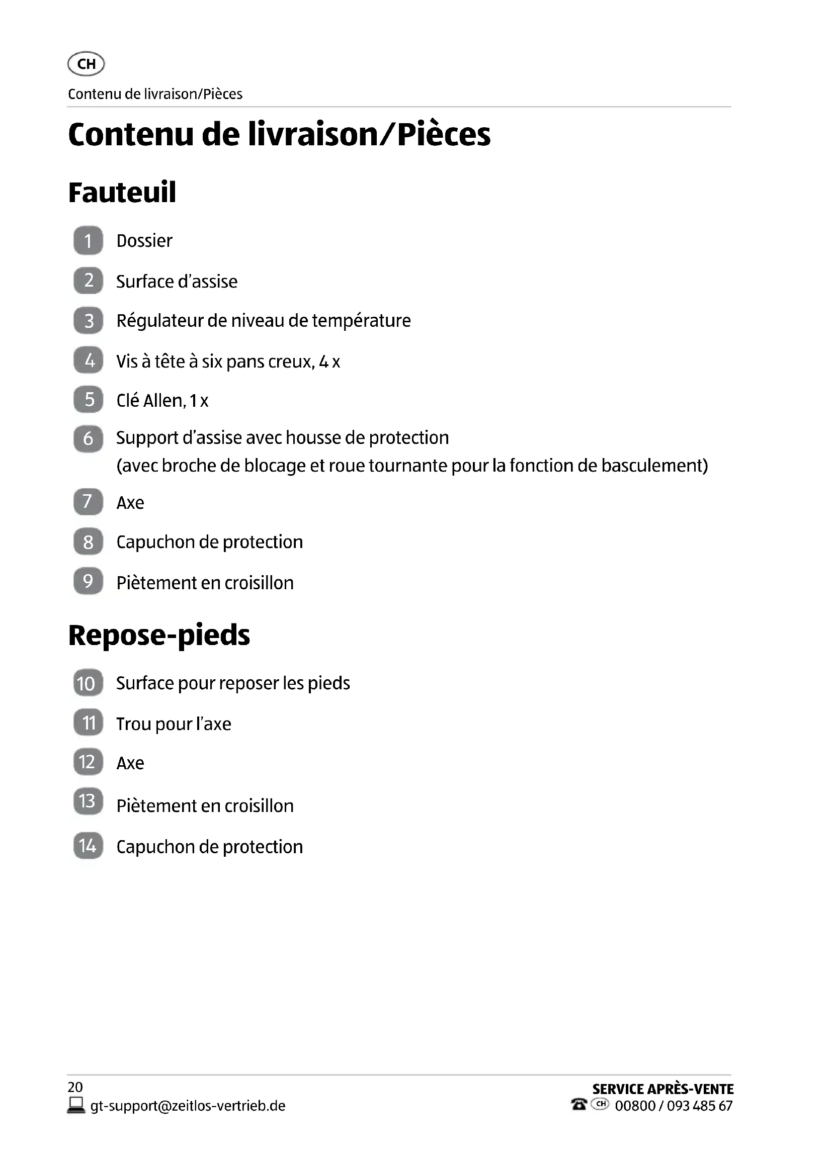 gt-support@zeitlos-vertrieb.de − Ne laissez pas le fauteuil avec la fonction de chauffage sans surveillance lors de son fonctionnement. − Ne laissez pas les enfants jouer avec le film d’emballage. Les enfants peuvent s’y emmêler et s’étouffer en jouant avec celui-ci. − Veillez à ce que les enfants ne puissent pas mettre de pièces de montage dans la bouche. Ne laissez pas les enfants s’approcher lors du montage. AVIS! Risque d’endommagement! Lorsque vous montez le fauteuil et le repose-pieds, vous pouvez endommager le fauteuil, le repose-pieds et le sol. − Montez le fauteuil et le repose-pieds sur une surface souple et propre. Posez éventuellement une couverture ou similaire dessous pour ne pas endommager les surfaces du fauteuil et du sol. − Ne placez pas le fauteuil ni le repose-pieds à proximité immé- diate de sources de chaleur comme les poêles. − N’exposez jamais le fauteuil et le repose-pieds à des influences météorologiques (par ex. la pluie). − N’utilisez plus le fauteuil lorsque les composants du fauteuil présentent des fissures ou fêlures, ou s’ils se sont déformés. Ne remplacez les éléments que par des pièces de rechange d’origine. − Ne mettez pas le câble électrique au contact des parties brûlantes. − Le fauteuil est pourvu d’un élément d’assise rotatif (230°max.). Ne tournez pas l’élément d’assise au-delà de la butée. − Le fauteuil et le repose-pieds sont conçus pour être placés à un endroit fixe. Si vous souhaitez malgré tout déplacer le fauteuil et le repose-pieds, vous risquez de rayer ou d’endommager le sol. Soulevez toujours le fauteuil avec une deuxième personne si vous souhaitez le changer d’emplacement.Première mise en service