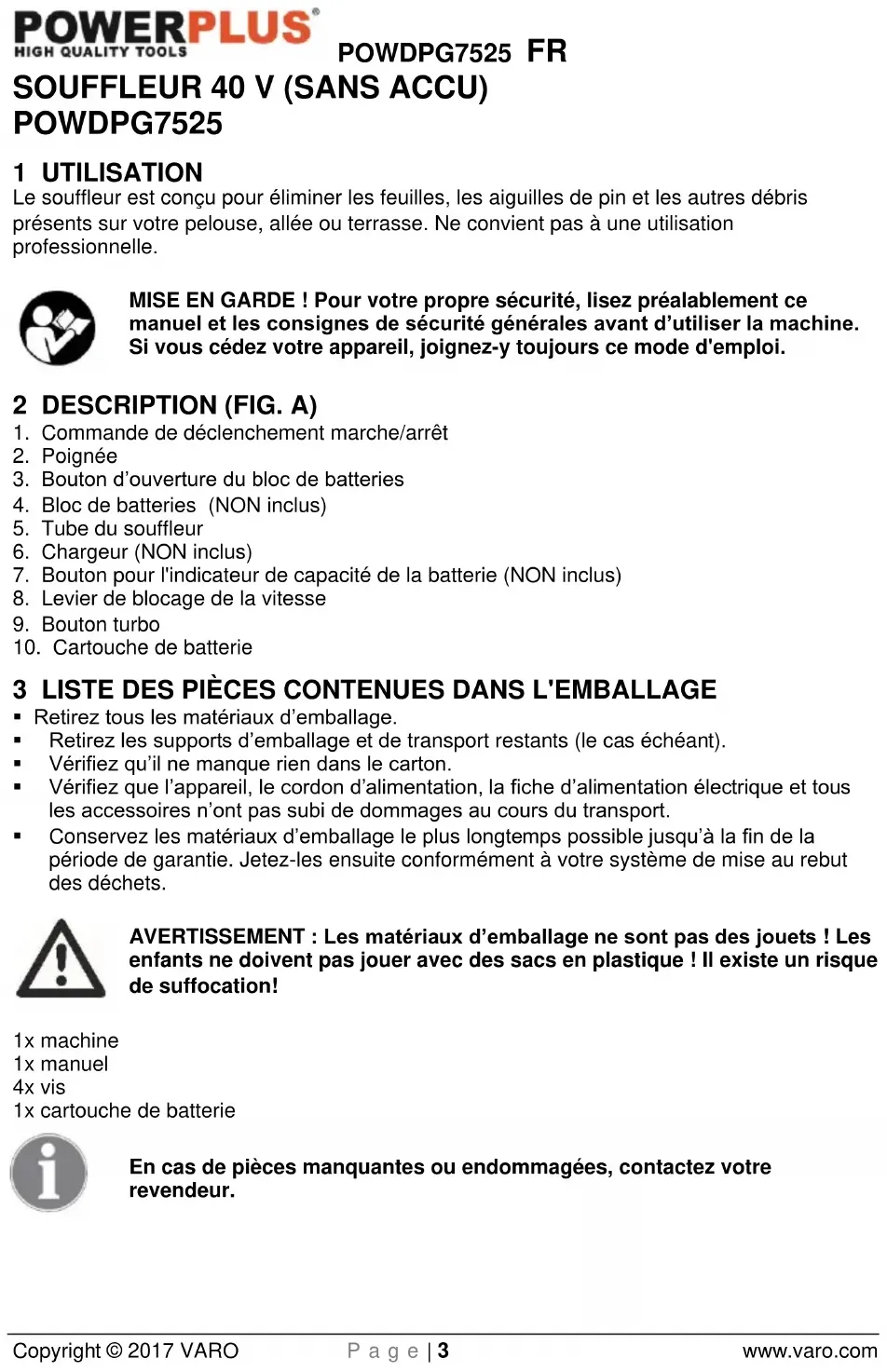 - Les avertissements, précautions et instructions contenues dans le présent manuel d'utilisation ne visent pas à couvrir toutes les conditions et situations susceptibles de survenir. L'utilisateur doit faire preuve de sens pratique et prendre les précautions qui s'imposent lors de l'installation, de l'utilisation et de l'entretien de l'appareil.POWDPG7525 FR Copyright © 2017 VARO P a g e | 7 www.varo.com 7 CONSIGNES DE SÉCURITÉ SUPPLÉMENTAIRES POUR LES