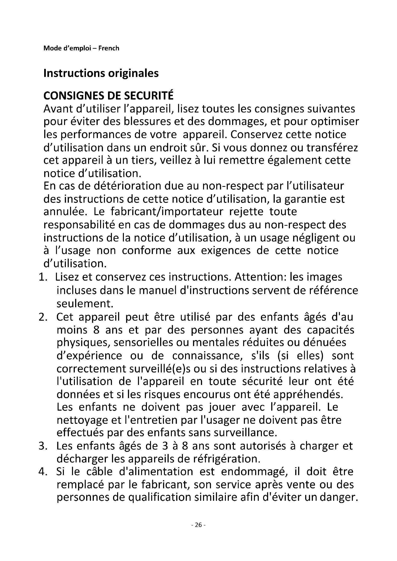 Avant d’utiliser l’appareil, lisez toutes les consignes suivantes pour éviter des blessures et des dommages, et pour optimiser les performances de votre appareil. Conservez cette notice d’utilisation dans un endroit sûr. Si vous donnez ou transférez cet appareil à un tiers, veillez à lui remettre également cette notice d’utilisation. En cas de détérioration due au non-respect par l’utilisateur des instructions de cette notice d’utilisation, la garantie est annulée. Le fabricant/importateur rejette toute responsabilité en cas de dommages dus au non-respect des instructions de la notice d’utilisation, à un usage négligent ou à l’usage non conforme aux exigences de cette notice d’utilisation.