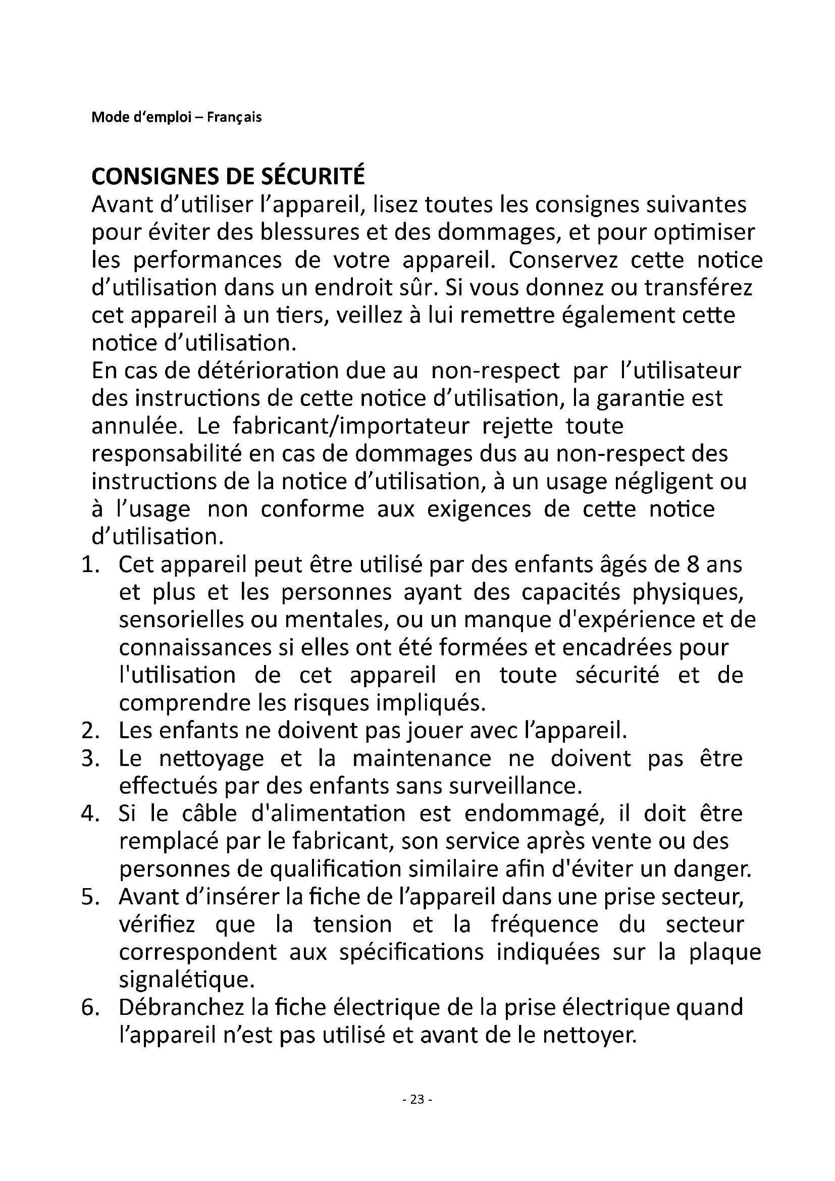 Avant d’utiliser l’appareil, lisez toutes les consignes suivantes pour éviter des blessures et des dommages, et pour optimiser les performances de votre appareil. Conservez cette notice d’utilisation dans un endroit sûr. Si vous donnez ou transférez cet appareil à un tiers, veillez à lui remettre également cette notice d’utilisation. En cas de détérioration due au non-respect par l’utilisateur des instructions de cette notice d’utilisation, la garantie est annulée. Le fabricant/importateur rejette toute responsabilité en cas de dommages dus au non-respect des instructions de la notice d’utilisation, à un usage négligent ou à l’usage non conforme aux exigences de cette notice d’utilisation.