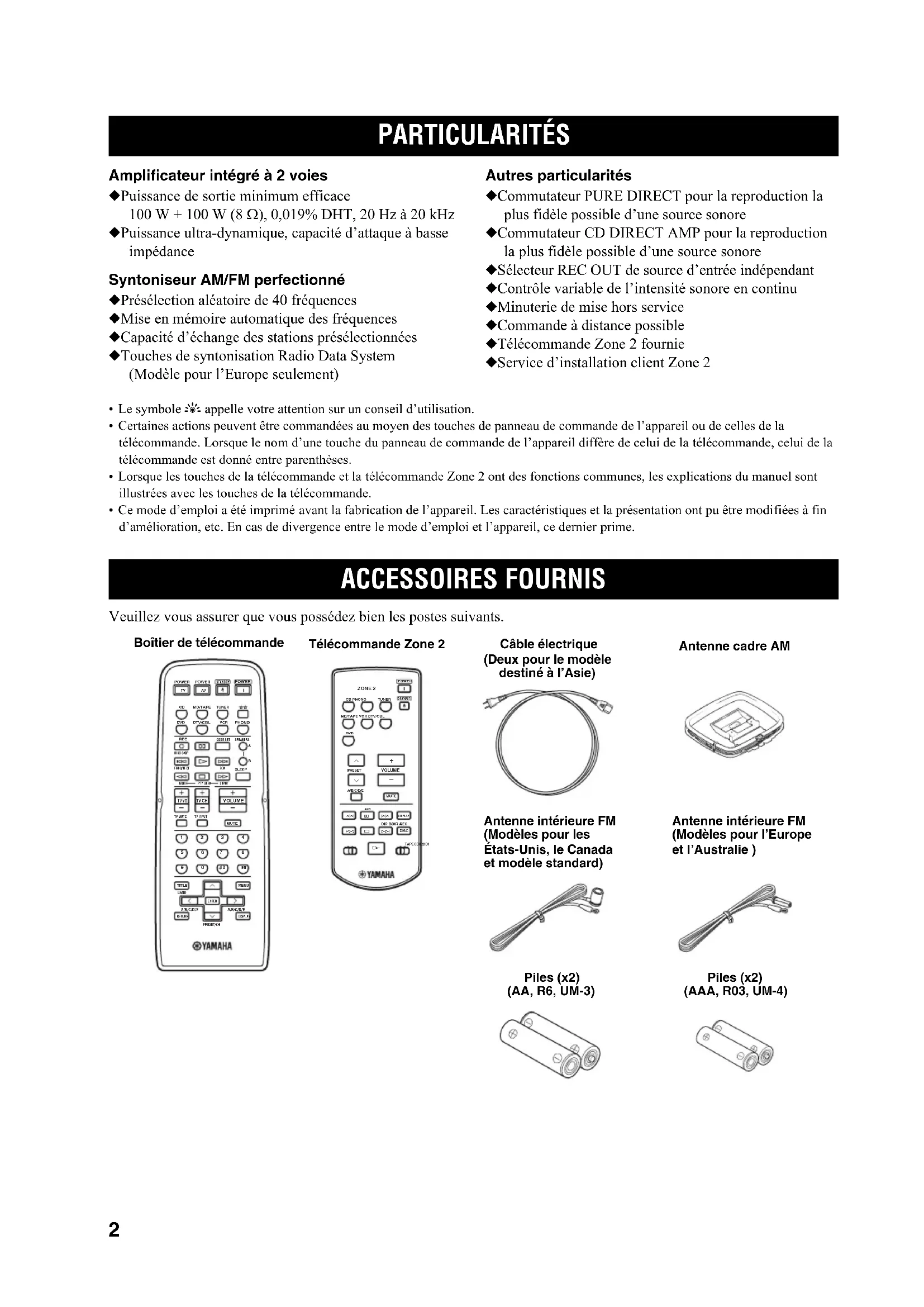 Amplificateur intégré à 2 voies ◆ Puissance de sortie minimum efficace 100 W + 100 W (8 Ω), 0,019% DHT, 20 Hz à 20 kHz ◆ Puissance ultra-dynamique, capacité d’attaque à basse impédance Syntoniseur AM/FM perfectionné ◆ Présélection aléatoire de 40 fréquences ◆ Mise en mémoire automatique des fréquences ◆ Capacité d’échange des stations présélectionnées ◆ Touches de syntonisation Radio Data System (Modèle pour l’Europe seulement) Autres particularités ◆ Commutateur PURE DIRECT pour la reproduction la plus fidèle possible d’une source sonore ◆ Commutateur CD DIRECT AMP pour la reproduction la plus fidèle possible d’une source sonore ◆ Sélecteur REC OUT de source d’entrée indépendant ◆ Contrôle variable de l’intensité sonore en continu ◆ Minuterie de mise hors service ◆ Commande à distance possible ◆ Télécommande Zone 2 fournie ◆ Service d’installation client Zone 2