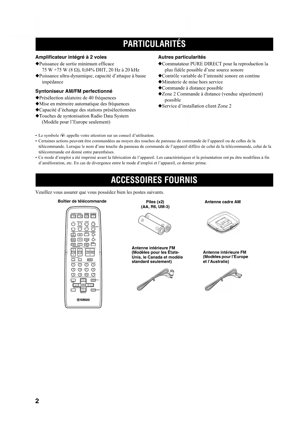 Amplificateur intégré à 2 voies ◆ Puissance de sortie minimum efficace 75 W +75 W (8 Ω), 0,04% DHT, 20 Hz à 20 kHz ◆ Puissance ultra-dynamique, capacité d’attaque à basse impédance Syntoniseur AM/FM perfectionné ◆ Présélection aléatoire de 40 fréquences ◆ Mise en mémoire automatique des fréquences ◆ Capacité d’échange des stations présélectionnées ◆ Touches de syntonisation Radio Data System (Modèle pour l’Europe seulement) Autres particularités ◆ Commutateur PURE DIRECT pour la reproduction la plus fidèle possible d’une source sonore ◆ Contrôle variable de l’intensité sonore en continu ◆ Minuterie de mise hors service ◆ Commande à distance possible ◆ Zone 2 Commande à distance (vendue séparément) possible ◆ Service d’installation client Zone 2