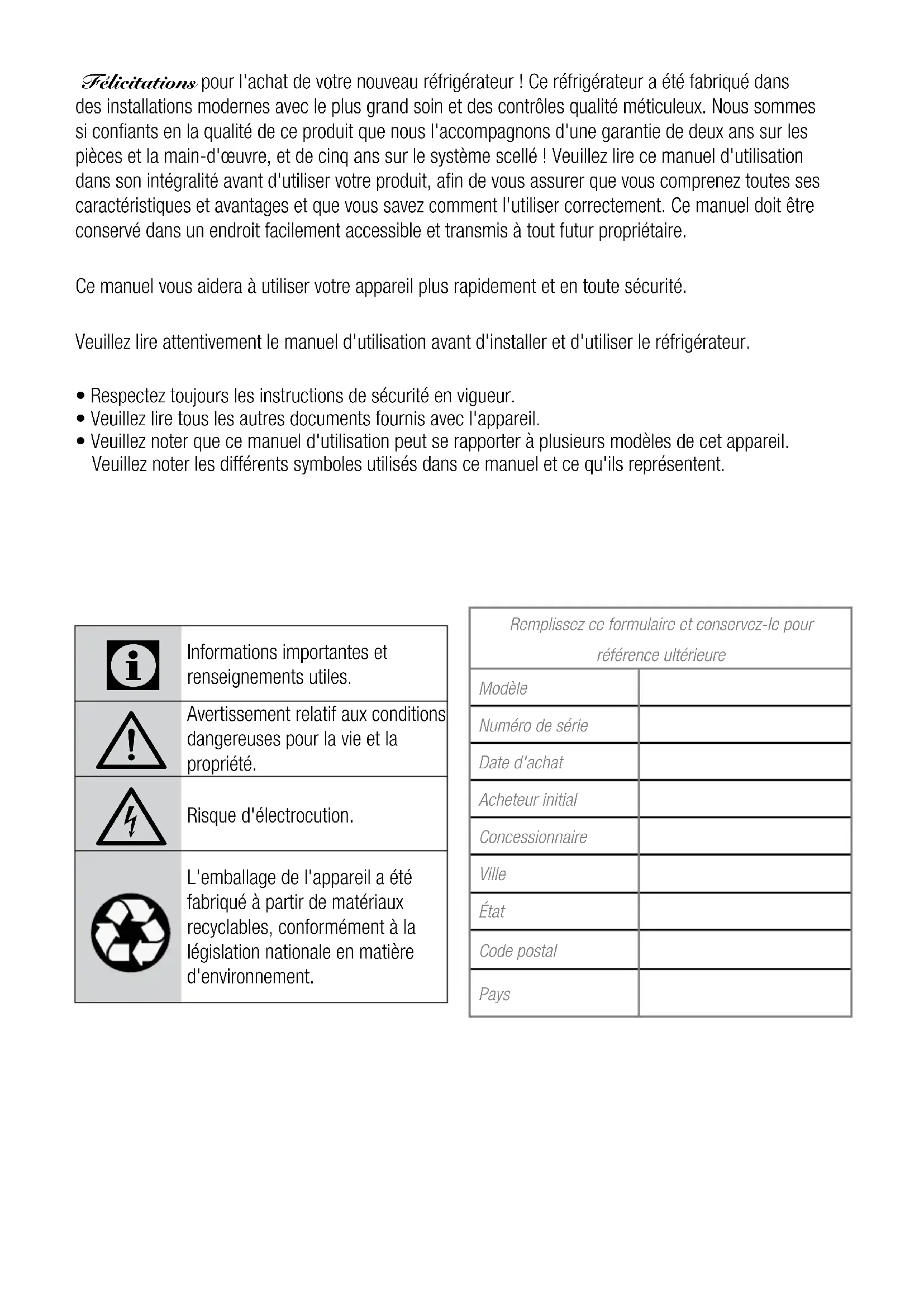 EKO US RESIDENTIAL PRODUCT WARRANTYFélicitations pour l'achat de votre nouveau réfrigérateur ! Ce réfrigérateur a été fabriqué dans des installations modernes avec le plus grand soin et des contrôles qualité méticuleux. Nous sommes si confiants en la qualité de ce produit que nous l'accompagnons d'une garantie de deux ans sur les pièces et la main-d'œuvre, et de cinq ans sur le système scellé ! Veuillez lire ce manuel d'utilisation dans son intégralité avant d'utiliser votre produit, afin de vous assurer que vous comprenez toutes ses caractéristiques et avantages et que vous savez comment l'utiliser correctement. Ce manuel doit être conservé dans un endroit facilement accessible et transmis à tout futur propriétaire. Ce manuel vous aidera à utiliser votre appareil plus rapidement et en toute sécurité. Veuillez lire attentivement le manuel d'utilisation avant d'installer et d'utiliser le réfrigérateur. t3FTQFDUF[UPVKPVSTMFTJOTUSVDUJPOTEFTÏDVSJUÏFOWJHVFVS t7FVJMMF[MJSFUPVTMFTBVUSFTEPDVNFOUTGPVSOJTBWFDMhBQQBSFJM t7FVJMMF[OPUFSRVFDFNBOVFMEhVUJMJTBUJPOQFVUTFSBQQPSUFSËQMVTJFVSTNPEÒMFTEFDFUBQQBSFJM Veuillez noter les différents symboles utilisés dans ce manuel et ce qu'ils représentent. Remplissez ce formulaire et conservez-le pour référence ultérieure Modèle Numéro de série Date d'achat Acheteur initial Concessionnaire Ville État Code postal Pays