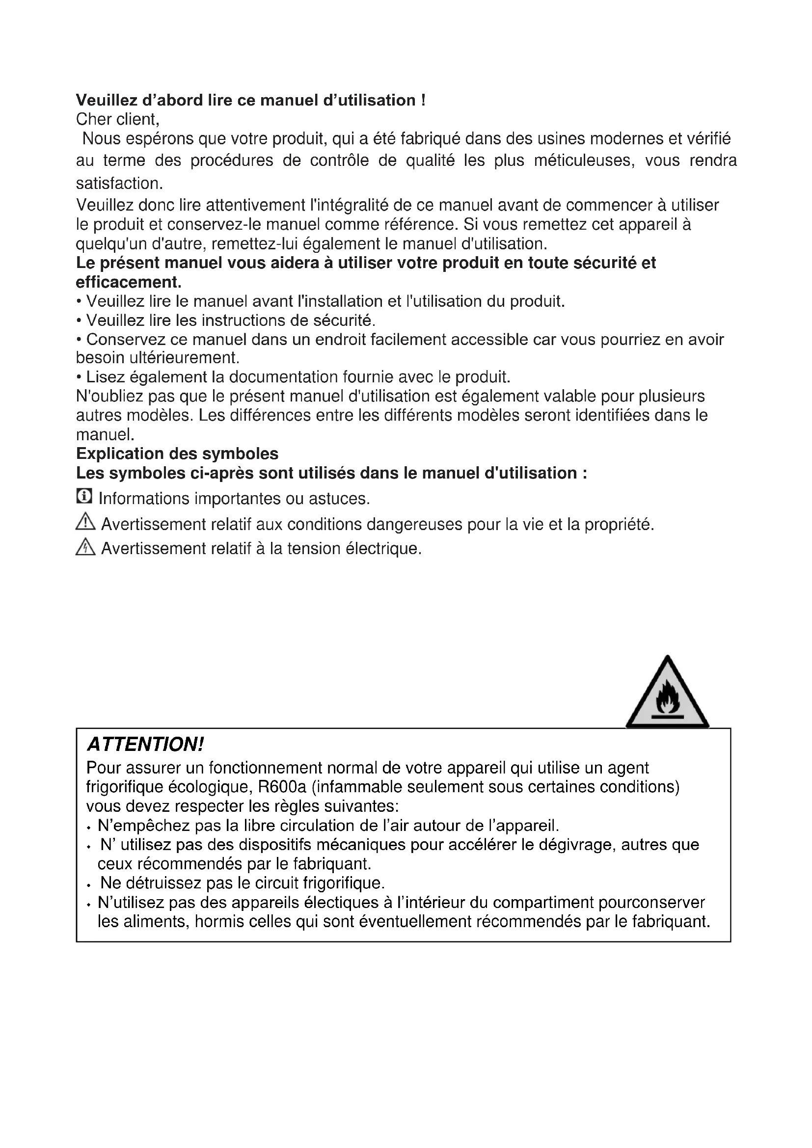 - Lisez également la documentation fournie avec le produit. N'oubliez pas que le présent manuel d'utilisation est également valable pour plusieurs autres modèles. Les différences entre les différents modèles seront identifiées dans le manuel. Explication des symboles Les symboles ci-après sont utilisés dans le manuel d'utilisation : Informations importantes ou astuces. Avertissement relatif aux conditions dangereuses pour la vie et la propriété. Avertissement relatif à la tension électrique. ATTENTION! Pour assurer un fonctionnement normal de votre appareil qui utilise un agent frigorifique écologique, R600a (infammable seulement sous certaines conditions) vous devez respecter les règles suivantes: N’empêchez pas la libre circulation de l’air autour de l’appareil. N’ utilisez pas des dispositifs mécaniques pour accélérer le dégivrage, autres que ceux récommendés par le fabriquant. Ne détruissez pas le circuit frigorifique. N’utilisez pas des appareils électiques à l’intérieur du compartiment pourconserver les aliments, hormis celles qui sont éventuellement récommendés par le fabriquant.1 Votre réfrigérateur 3 2 Précautions de sécurité Importantes 4 Utilisation préconisée ............................. 4 Sécurité générale ................................... 4 Pour les appareils dotés d'une fontaine à eau ....................................................... 6 Sécurité enfants ...................................... 6 Conformité avec la réglementation DEEE et mise au rebut des déchets ...... 6 Informations relatives à l'emballage ....... 7 Avertissement sur l'usage de fluides frigorigènes ............................................. 7 Mesures d’économie d’énergie .............. 7 3 Installation 8 Éléments à prendre en considération lors du déménagement de votre réfrigérateur ................................... .8 Avant de mettre votre réfrigérateur en marche, ................................................... .8 Branchements électriques ...................... 8 Mise au rebut de l’emballage ................. 8 Mise au rebut de votre ancien réfrigérateur ............................................ 9 Disposition et Installation ........................ 9 Remplacement de l'ampoule .................. 9 Réglage des pieds .................................. 9 4 Préparation 10 5 Utilisation du réfrigérateur 11 Réglage de la temperature 11 Utilisation des compartiments intérieurs………………………………….. 11 Réversibilité de la porte ………………… 12 Congélation d'aliments frais …………… 13 Compartiment fraîcheur 13 Recommandations concernant la conservation des aliments congelés 14 Dégivrage 14 Disposition des denrées 14 Informations concernant la congélation 15 Recommandations relatives au Compartiment 0/3 degré 15 6 Entretien et nettoyage 16 Protection des surfaces en plastique 16 7 Dépannage 17