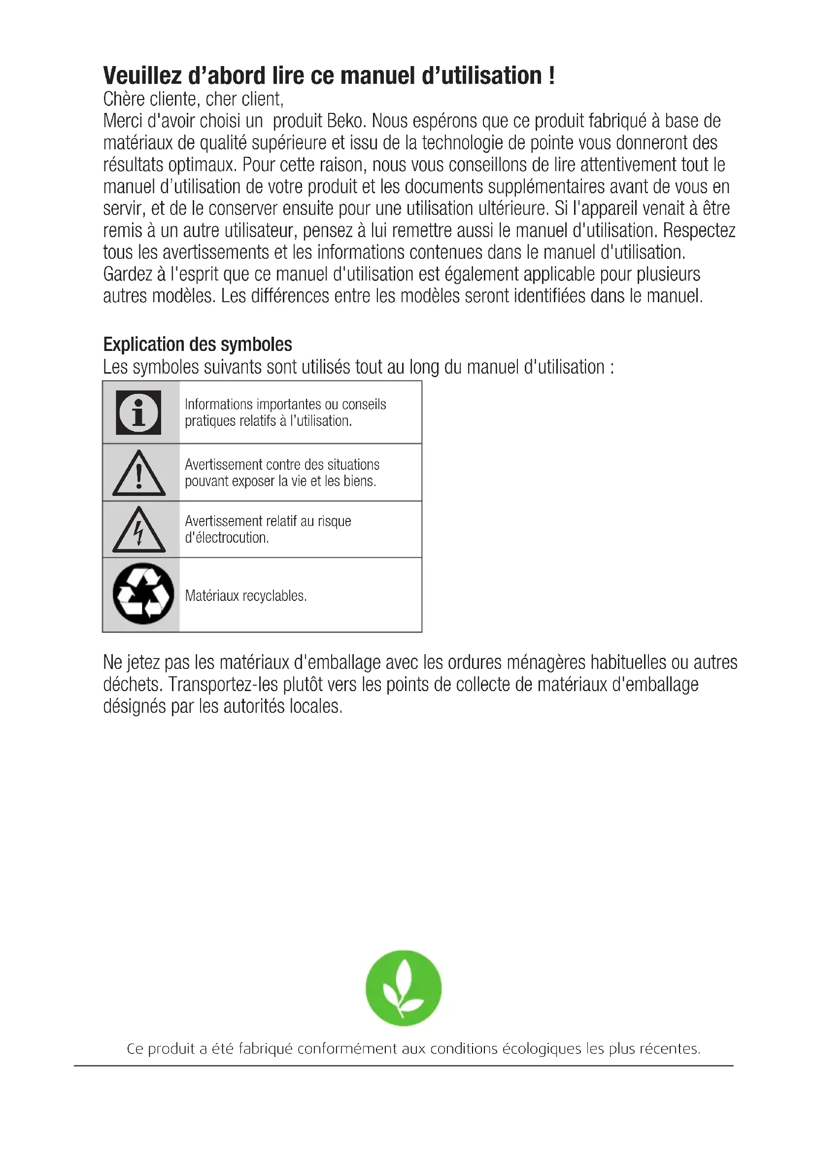 Lave-linge Manuel d‘utilisation Waschmaschine Bedienungsanleitung 60081664CH1 FR / DE 2820528492_FR/ 01-09-20.(17:07) Numéro de document :Veuillez d’abord lire ce manuel d’utilisation ! Chère cliente, cher client, Merci d'avoir choisi un produit Beko. Nous espérons que ce produit fabriqué à base de matériaux de qualité supérieure et issu de la technologie de pointe vous donneront des résultats optimaux. Pour cette raison, nous vous conseillons de lire attentivement tout le manuel d’utilisation de votre produit et les documents supplémentaires avant de vous en servir, et de le conserver ensuite pour une utilisation ultérieure. Si l'appareil venait à être remis à un autre utilisateur, pensez à lui remettre aussi le manuel d'utilisation. Respectez tous les avertissements et les informations contenues dans le manuel d'utilisation. Gardez à l'esprit que ce manuel d'utilisation est également applicable pour plusieurs autres modèles. Les différences entre les modèles seront identifiées dans le manuel. Explication des symboles Les symboles suivants sont utilisés tout au long du manuel d'utilisation :