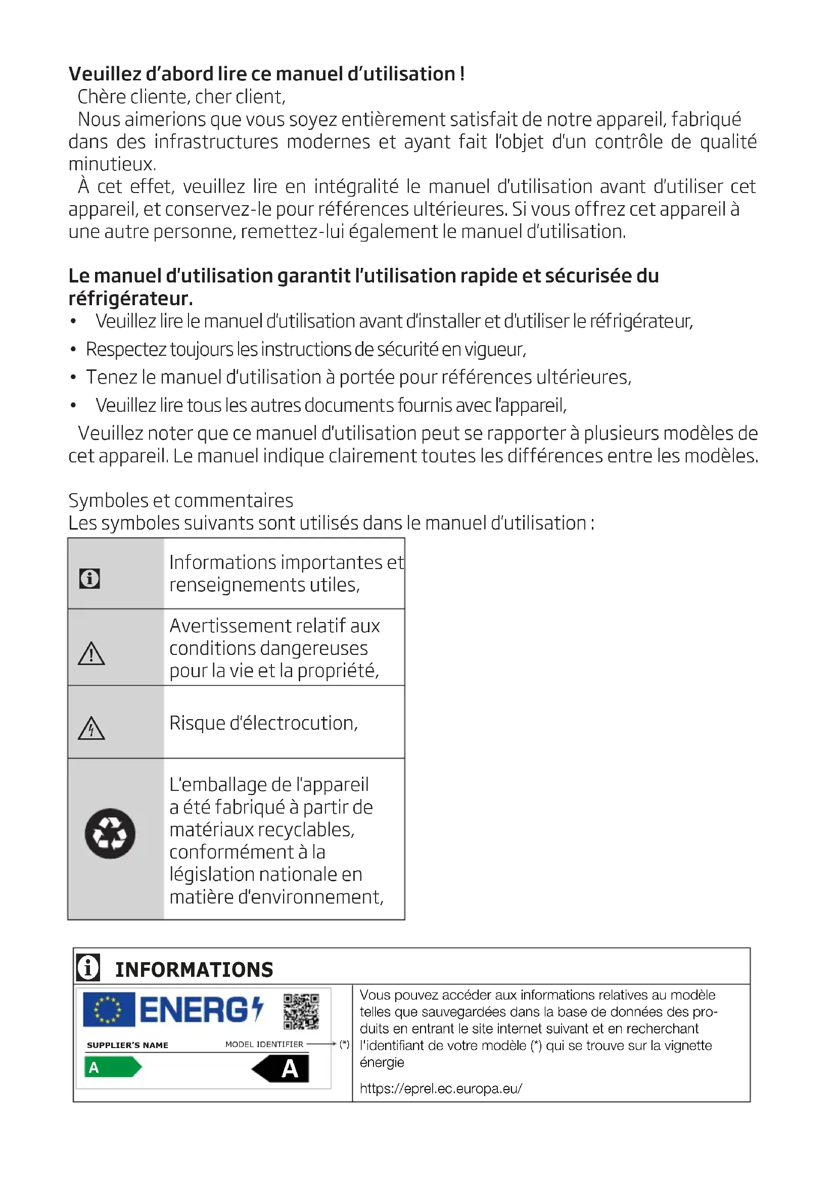 - Veuillez lire le manuel d'utilisation avant d'installer et d 'utiliser le réf ri gérate ur,