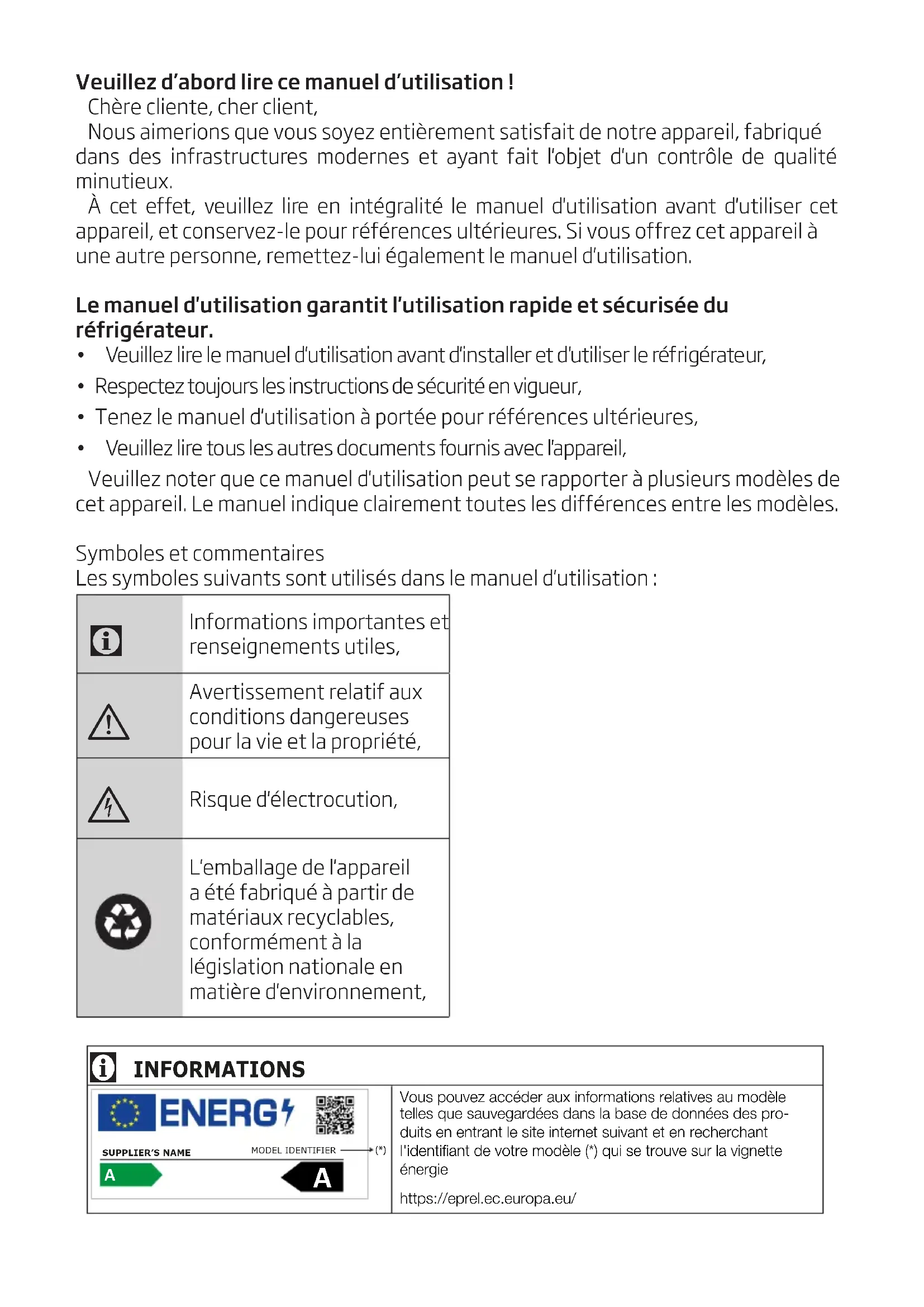 - Si cet appareil venait à changer de propriétaire, n'oubliez pas de remettre la présente notice d’utilisation au nouveau bénéficiaire.6 / 28 FR Le réfrigérateur/Le guide d’utilisation Instructions en matière de sécurité et d’environnement