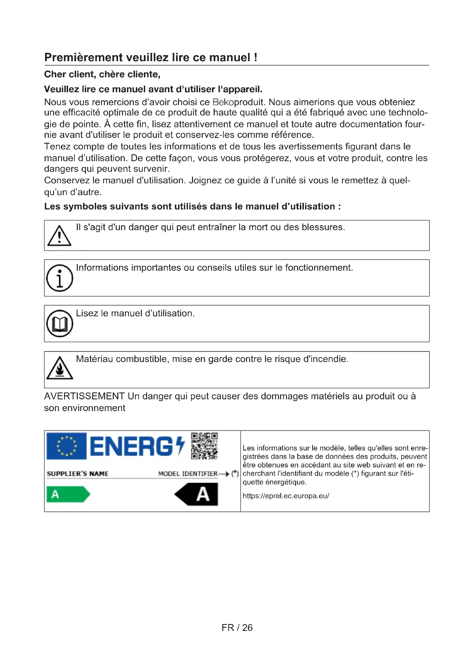 Premièrement veuillez lire ce manuel ! Cher client, chère cliente, Veuillez lire ce manuel avant d'utiliser l'appareil. Nous vous remercions d’avoir choisi ce Bekoproduit. Nous aimerions que vous obteniez une efficacité optimale de ce produit de haute qualité qui a été fabriqué avec une technolo- gie de pointe. À cette fin, lisez attentivement ce manuel et toute autre documentation four- nie avant d'utiliser le produit et conservez-les comme référence. Tenez compte de toutes les informations et de tous les avertissements figurant dans le manuel d’utilisation. De cette façon, vous vous protégerez, vous et votre produit, contre les dangers qui peuvent survenir. Conservez le manuel d'utilisation. Joignez ce guide à l’unité si vous le remettez à quel- qu’un d’autre. Les symboles suivants sont utilisés dans le manuel d’utilisation: Il s'agit d'un danger qui peut entraîner la mort ou des blessures. Informations importantes ou conseils utiles sur le fonctionnement. Lisez le manuel d’utilisation. Matériau combustible, mise en garde contre le risque d'incendie. AVERTISSEMENT Un danger qui peut causer des dommages matériels au produit ou à son environnement Les informations sur le modèle, telles qu'elles sont enre- gistrées dans la base de données des produits, peuvent être obtenues en accédant au site web suivant et en re- cherchant l'identifiant du modèle (*) figurant sur l'éti- quette énergétique. https://eprel.ec.europa.eu/FR / 27 1 Consignes de sécurité.................. 28