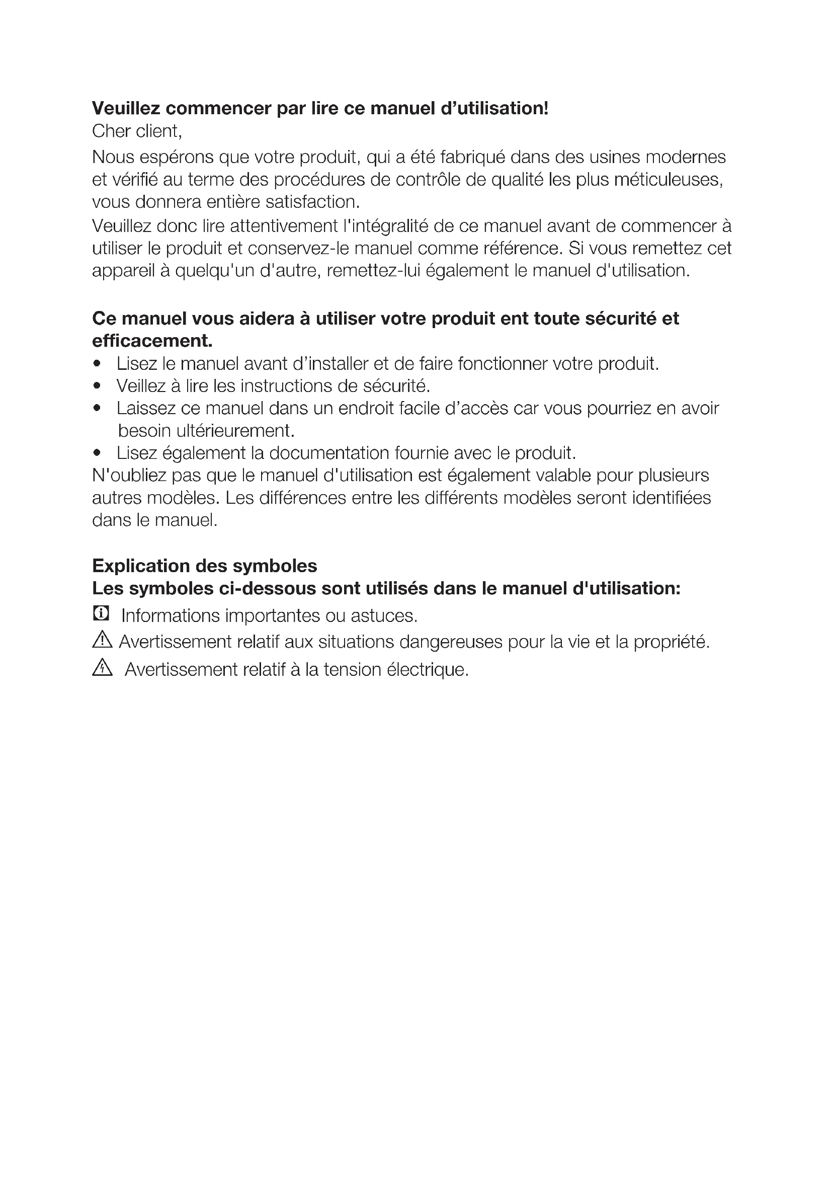 - Lisez le manuel avant d’installer et de faire fonctionner votre produit.