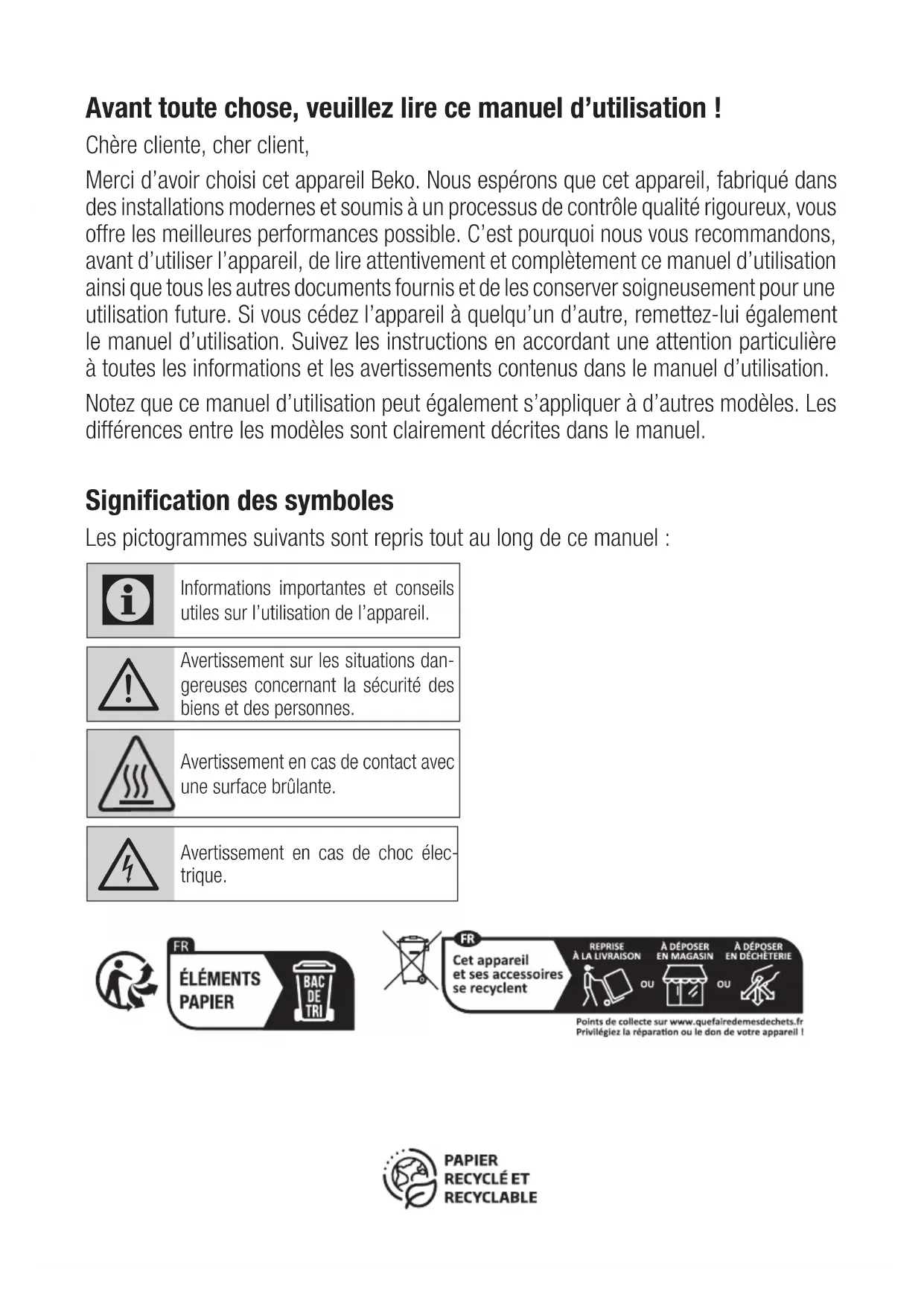 - Dropping the appliance will render it non-opera- tional or cause permanent damage.Avant toute chose, veuillez lire ce manuel d’utilisation ! Chère cliente, cher client, Merci d’avoir choisi cet appareil Beko. Nous espérons que cet appareil, fabriqué dans des installations modernes et soumis à un processus de contrôle qualité rigoureux, vous offre les meilleures performances possible. C’est pourquoi nous vous recommandons, avant d’utiliser l’appareil, de lire attentivement et complètement ce manuel d’utilisation ainsi que tous les autres documents fournis et de les conserver soigneusement pour une utilisation future. Si vous cédez l’appareil à quelqu’un d’autre, remettez-lui également le manuel d’utilisation. Suivez les instructions en accordant une attention particulière à toutes les informations et les avertissements contenus dans le manuel d’utilisation. Notez que ce manuel d’utilisation peut également s’appliquer à d’autres modèles. Les différences entre les modèles sont clairement décrites dans le manuel. Signification des symboles Les pictogrammes suivants sont repris tout au long de ce manuel :