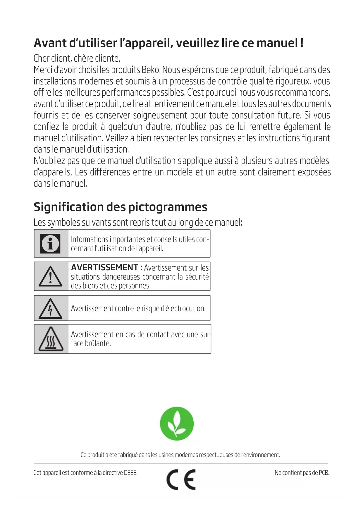 - Platzeren Se kene Gegenstände auf der Duns- tabzugshaube. • Schützen Se de Außensete vor Stoßenwrkungen. • Verpacken Se das Gerät so, dass es während des Transports ncht beschädgt wrd.Ce produit a été fabriqué dans les usines modernes respectueuses de l’environnement.Cet appareil est conforme à la directive DEEE.Ne contient pas de PCB. Avant d'utiliser l'appareil, veuillez lire ce manuel ! Cher client, chère cliente, Merci d’avoir choisi les produits Beko. Nous espérons que ce produit, fabriqué dans des installations modernes et soumis à un processus de contrôle qualité rigoureux, vous offre les meilleures performances possibles. C’est pourquoi nous vous recommandons, avant d’utiliser ce produit, de lire attentivement ce manuel et tous les autres documents fournis et de les conserver soigneusement pour toute consultation future. Si vous confiez le produit à quelqu’un d’autre, n’oubliez pas de lui remettre également le manuel d’utilisation. Veillez à bien respecter les consignes et les instructions figurant dans le manuel d’utilisation. N'oubliez pas que ce manuel d'utilisation s'applique aussi à plusieurs autres modèles d'appareils. Les différences entre un modèle et un autre sont clairement exposées dans le manuel. Signification des pictogrammes Les symboles suivants sont repris tout au long de ce manuel: