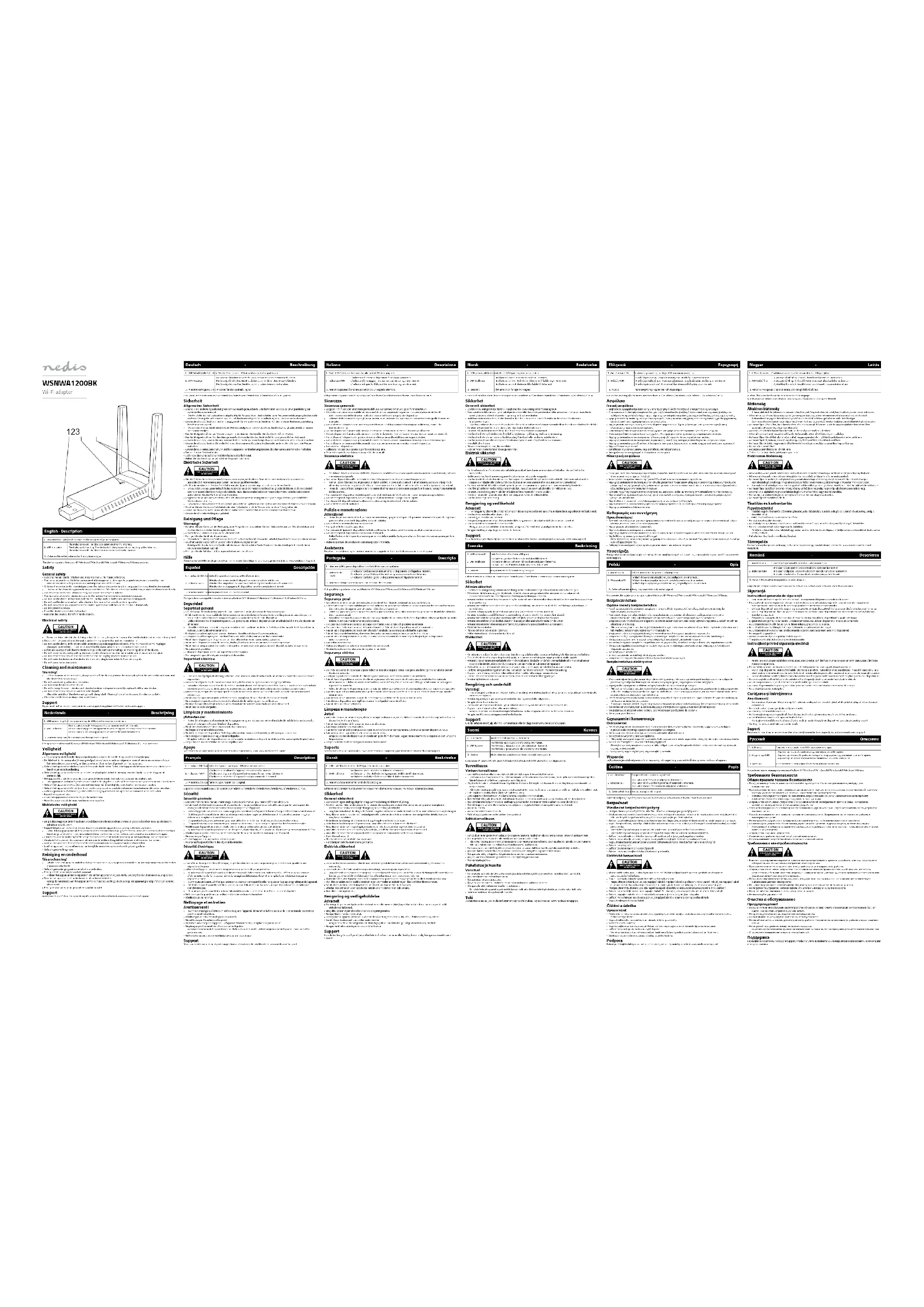 - Avant le nettoyage ou l'entretien, arrêtez toujours l'appareil, débranchez la che secteur de la prise murale et attendez que l'appareil refroidisse.• N'utilisez pas de solvants ni de produits abrasifs.• Ne nettoyez pas l'intérieur de l'appareil.• Ne tentez pas de réparer l'appareil. Si l'appareil fonctionne mal, remplacez-le par un neuf.• Ne plongez pas l'appareil dans l'eau ou autres liquides. Nettoyez l'extérieur de l'appareil avec un chion doux et humide. Séchez soigneusement l'appareil avec un chion propre et sec.• Nettoyez les ouvertures de ventilation avec une brosse douce. Support Si vous avez des commentaires, des suggestions ou besoin d'aide, veuillez visiter www.nedis.com/support. Italiano - Descrizione 1. Porta USB Collegare il dispositivo alla porta USB del computer.2. Indicatore WiFiL’indicatore è acceso: Il dispositivo è collegato a Internet.L’indicatore lampeggia: Il dispositivo sta per collegarsi a Internet.L'indicatore è spento: Il dispositivo non è collegato a Internet.3. Antenna Spostare l’antenna per ottenere un segnale ottimale.Il dispositivo supporta sistemi Windows XP/ Windows7/Windows8.0/Windows8.1/Windows10/Linux. Sicurezza Sicurezza generale