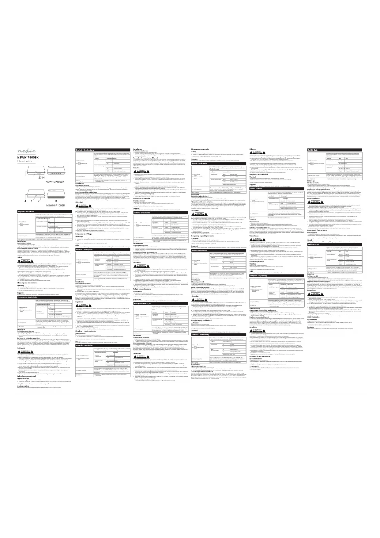 - Limpie el exterior del dispositivo con un paño suave humedecido. Apoyo Si necesita ayuda adicional o si tiene comentarios o sugerencias, visite www.nedis.com/support Français - Description 1. Indicateur d'alimentation (vert)2. Indicateur de lien /activité (vert)Grâce aux indicateurs LED, vous suivez, diagnostiquez et dépannez tout problème potentiel du commutateur, de la connexion ou des dispositifs connexes.Indicateur lumineux État DescriptionIndicateur d'alimentationActivé Sous tensionArrêt Alimentation arrêtIndicateur de lien /activitéActivé Connecté au portArrêt Déconnecté du portClignotementEnvoi /réception de données3. Points de connexionLe commutateur Ethernet comporte plusieurs ports RJ-45 10/100/1000Mbps (NSWH5P100B: 5 ports / NSWH8P100B: 8 ports). Ces ports sont des points de connexion pour les PC et autres dispositifs en réseau (ex. commutateurs Ethernet additionnels).4. Entrée CC• Connectez un adaptateur d'alimentation à l'entrée CC du dispositif et à la prise murale. Installation Installation de bureau• Placez le commutateur Ethernet sur un bureau plat.