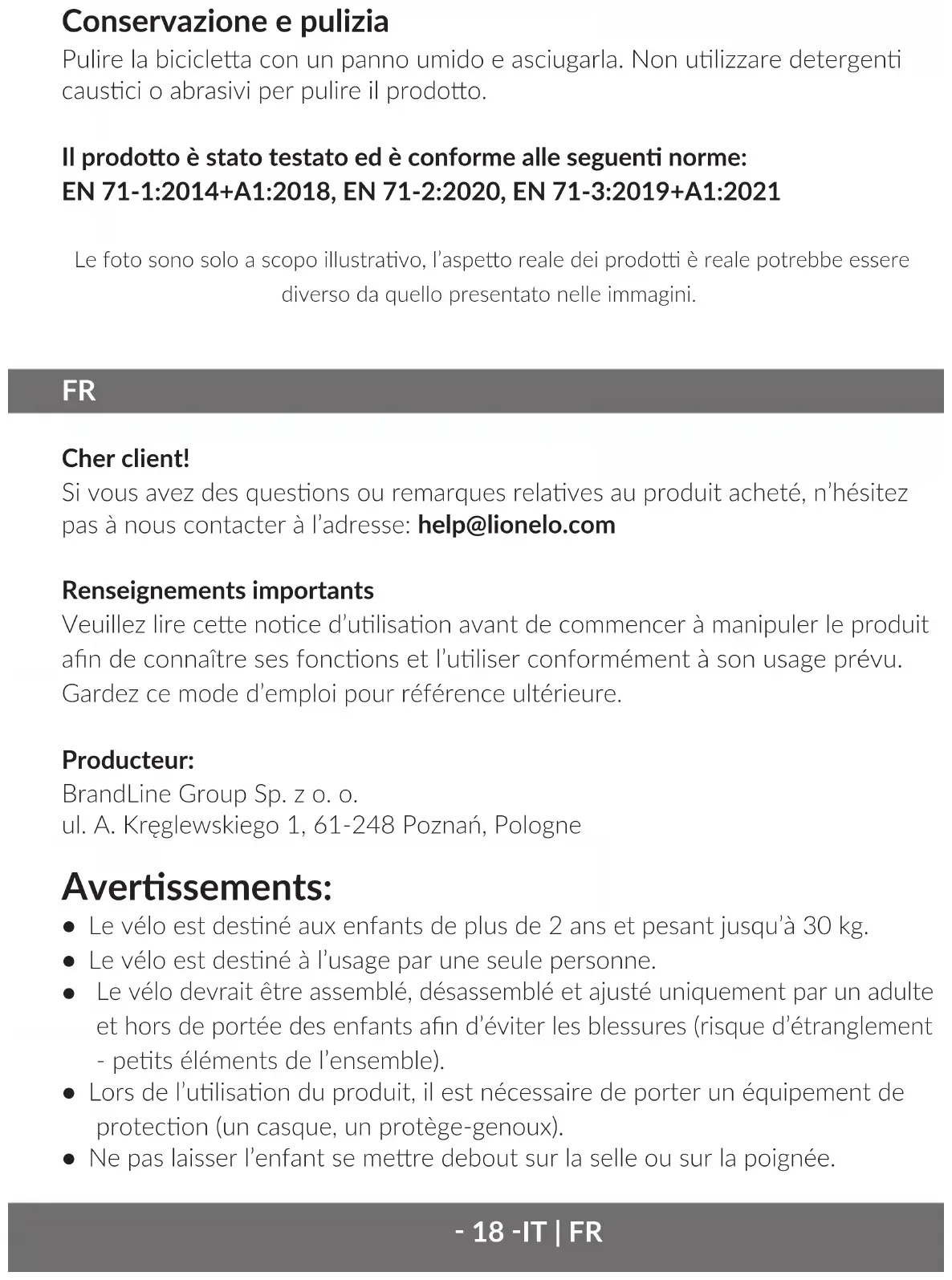 - Ne pas laisser l’enfant se mere debout sur la selle ou sur la poignée. Conservazione e pulizia Pulire la biciclea con un panno umido e asciugarla. Non ulizzare detergen causci o abrasivi per pulire il prodoo. Il prodoo è stato testato ed è conforme alle seguen norme: EN 71-1:2014+A1:2018, EN 71-2:2020, EN 71-3:2019+A1:2021 Le foto sono solo a scopo illustravo, l’aspeo reale dei prodo è reale potrebbe essere diverso da quello presentato nelle immagini. FR‑ 19 ‑ FR