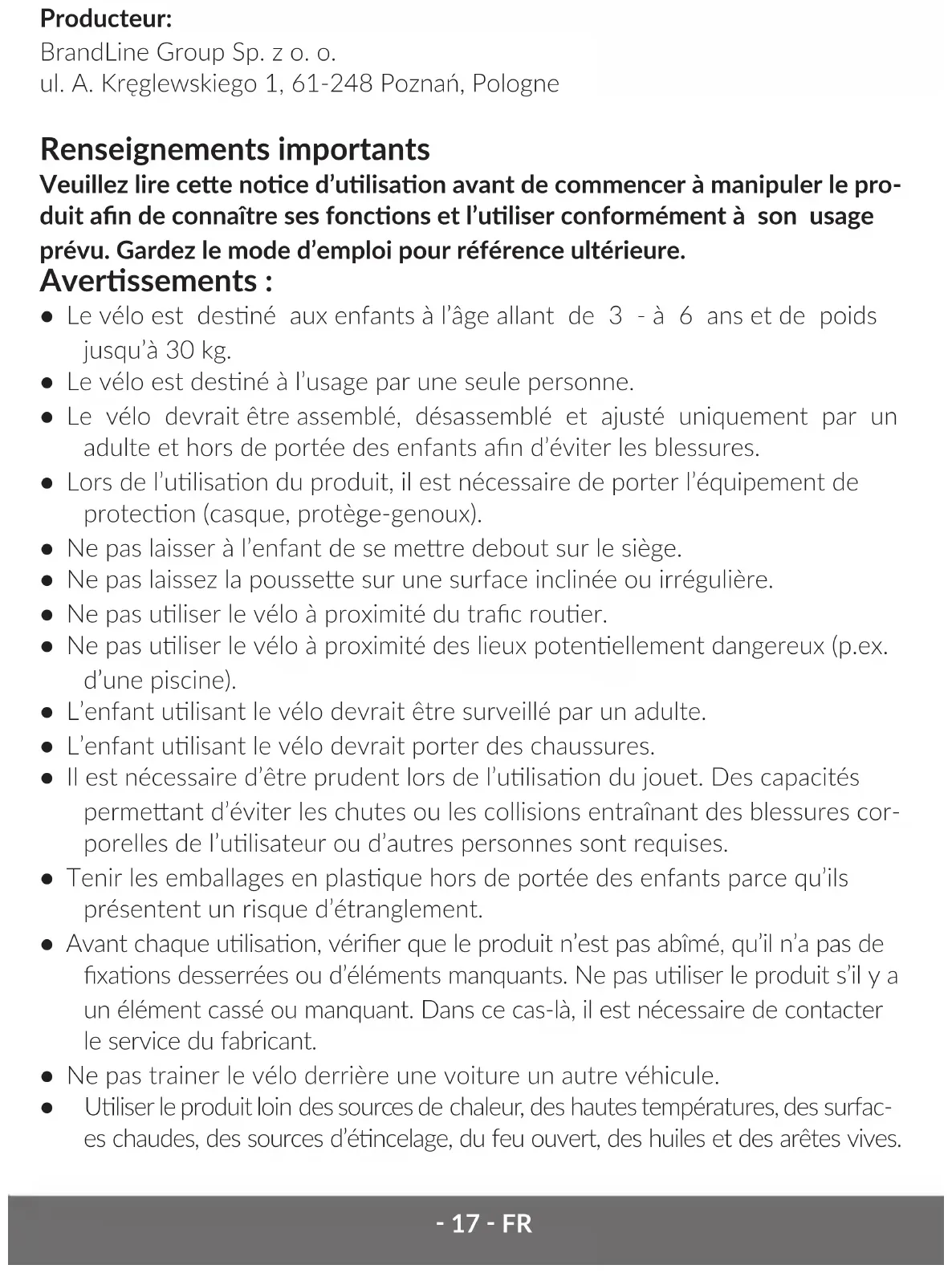 Cher client ! Si vous avez des quesons ou remarques relaves au produit acheté, n’hésitez pas à nous contacter à l’adresse : help@lionelo.com‑ 17 ‑ FR Producteur: BrandLine Group Sp. z o. o. ul. A. Kręglewskiego 1, 61-248 Poznań, Pologne Renseignements importants Veuillez lire cee noce d’ulisaon avant de commencer à manipuler le pro- duit an de connaître ses foncons et l’uliser conformément à son usage prévu. Gardez le mode d’emploi pour référence ultérieure. Averssements :